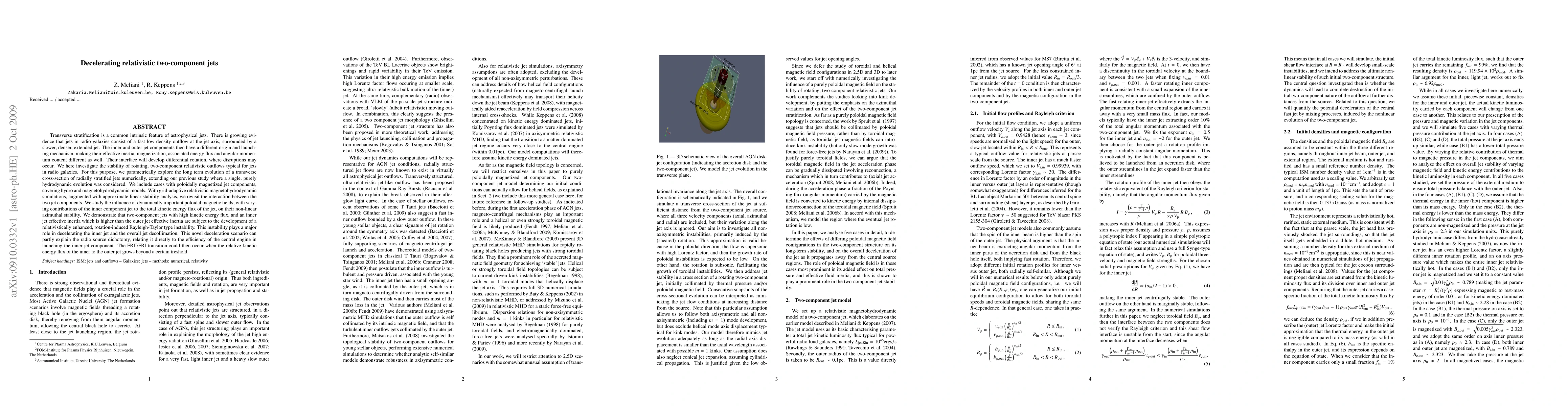 Transverse stratification is a common intrinsic feature of astrophysical jets. There is growing evidence that jets in radio galaxies consist of a fast low density outflow at the jet axis, surrounded by a slower, denser, extended jet. The inner and outer jet components then have a different origin and launching mechanism, making their effective inertia, magnetization, associated energy flux and angular momentum content different as well. Their interface will develop differential rotation, where disruptions may occur. We here investigate the stability of rotating, two-component relativistic outflows typical for jets in radio galaxies. For this purpose, we parametrically explore the long term evolution of a transverse cross-section of radially stratified jets numerically With grid-adaptive relativistic MHD simulations, augmented with approximate linear stability analysis. We study the influence of dynamically important poloidal magnetic fields, with varying contributions of the inner component jet to the total kinetic energy flux of the jet, on their non-linear azimuthal stability. We demonstrate that two-component jets with high kinetic energy flux, and an inner jet effective inertia which is higher than the outer jet effective inertia are subject to the development of a relativistically enhanced, rotation-induced Rayleigh-Taylor type instability. This instability plays a major role in decelerating the inner jet and the overall jet decollimation. This novel deceleration scenario can partly explain the radio source dichotomy, relating it directly to the efficiency of the central engine in launching the inner jet component. The FRII/FRI transition could then occur when the relative kinetic energy flux of the inner to the outer jet grows beyond a certain treshold.