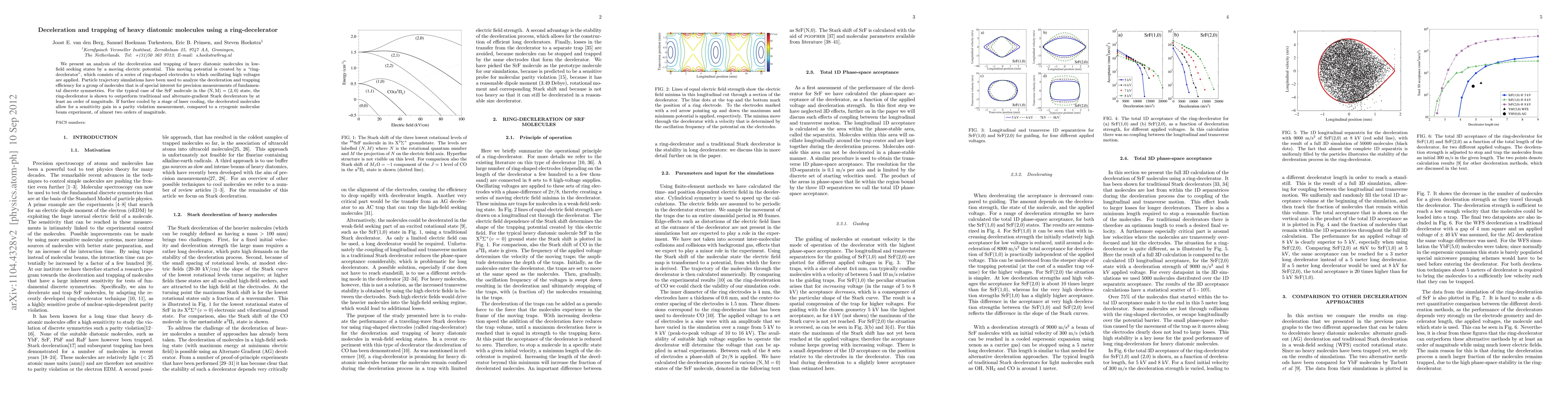 This paper analyzes the deceleration and trapping of heavy diatomic molecules using a ring-decelerator, demonstrating superior efficiency compared to traditional methods. The ring-decelerator, with its oscillating high voltages, achieves a significant improvement in precision measurements of fundamental discrete symmetries.