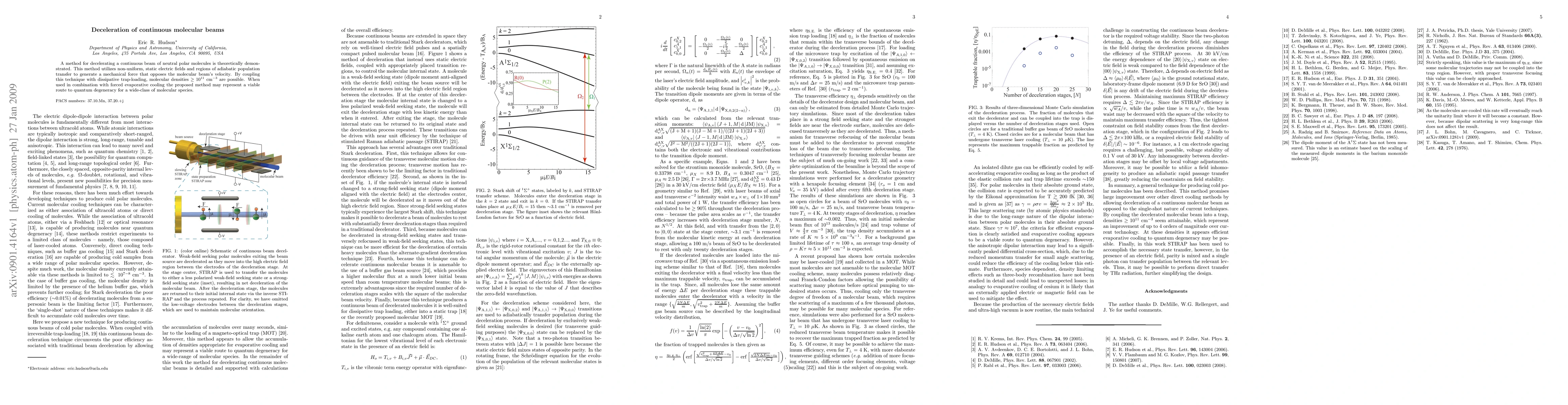 This paper proposes a method to decelerate continuous beams of neutral polar molecules using non-uniform electric fields and adiabatic population transfer, potentially achieving molecular densities of $10^{11}$ cm$^{-3}$ and enabling quantum degeneracy through forced evaporative cooling.