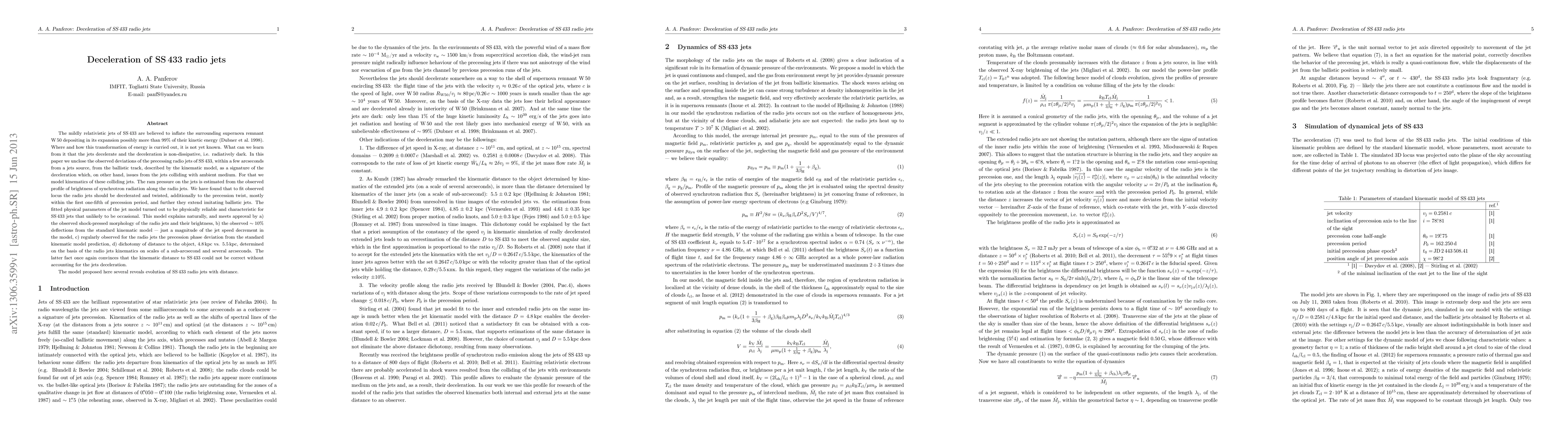 The mildly relativistic jets of SS\,433 are believed to inflate the surrounding supernova remnant W\,50 depositing in its expansion possibly more than 99% of their kinetic energy (\cite[1998]{Dub98}). Where and how this transformation of energy is curried out, it is not yet known. What can we learn from it that the jets decelerate and the deceleration is non-dissipative, i.e. radiatively dark. In this paper we unclose the observed deviations of the precessing radio jets of SS\,433, within a few arcseconds from a jets source, from the ballistic track, described by the kinematic model, as a signature of the deceleration which, on other hand, issues from the jets colliding with ambient medium. For that we model kinematics of these colliding jets. The ram pressure on the jets is estimated from the observed profile of brightness of synchrotron radiation along the radio jets. We have found that to fit observed locus the radio jets should be decelerated and twisted, additionally to the precession twist, mostly within the first one-fifth of precession period, and further they extend imitating ballistic jets. The fitted physical parameters of the jet model turned out to be physically reliable and characteristic for SS\,433 jets that unlikely to be occasional. This model explains naturally, and meets approval by a) the observed shock-pressed morphology of the radio jets and their brightness, b) the observed $\sim 10%$ deflections from the standard kinematic model --- just a magnitude of the jet speed decrement in the model, c) regularly observed for the radio jets the precession phase deviation from the standard kinematic model prediction, d) dichotomy of distance to the object, 4.8\,kpc vs. 5.5\,kpc, determined on the basis of the radio jets kinematics on scales of a sub-arcsecond and several arcseconds.