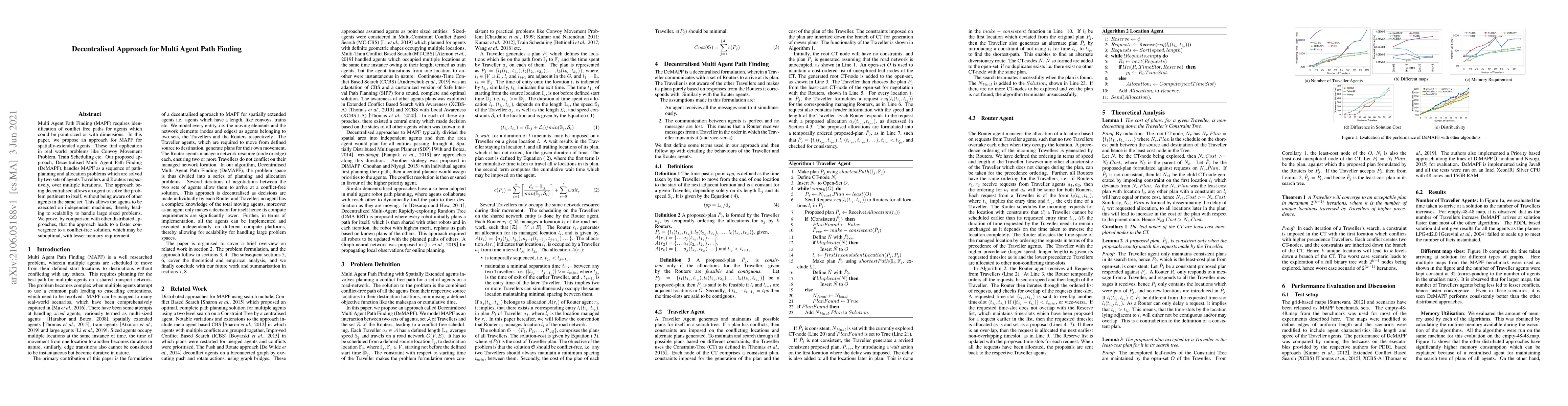 Summary: This paper proposes a decentralised approach, DeMAPF, for solving Multi Agent Path Finding (MAPF) problems for spatially-extended agents. The approach divides the problem into pathplanning and allocation tasks handled by Travellers and Routers, respectively, leading to faster convergence and scalability for large problems compared to other distributed methods.
