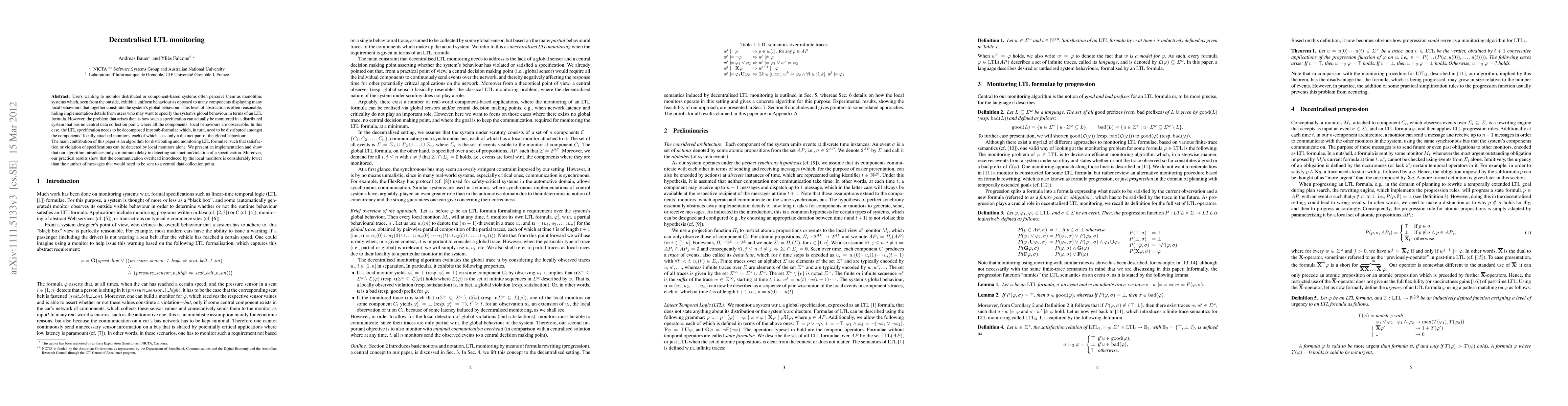 Users wanting to monitor distributed or component-based systems often perceive them as monolithic systems which, seen from the outside, exhibit a uniform behaviour as opposed to many components displaying many local behaviours that together constitute the system's global behaviour. This level of abstraction is often reasonable, hiding implementation details from users who may want to specify the system's global behaviour in terms of an LTL formula. However, the problem that arises then is how such a specification can actually be monitored in a distributed system that has no central data collection point, where all the components' local behaviours are observable. In this case, the LTL specification needs to be decomposed into sub-formulae which, in turn, need to be distributed amongst the components' locally attached monitors, each of which sees only a distinct part of the global behaviour. The main contribution of this paper is an algorithm for distributing and monitoring LTL formulae, such that satisfac- tion or violation of specifications can be detected by local monitors alone. We present an implementation and show that our algorithm introduces only a minimum delay in detecting satisfaction/violation of a specification. Moreover, our practical results show that the communication overhead introduced by the local monitors is considerably lower than the number of messages that would need to be sent to a central data collection point.