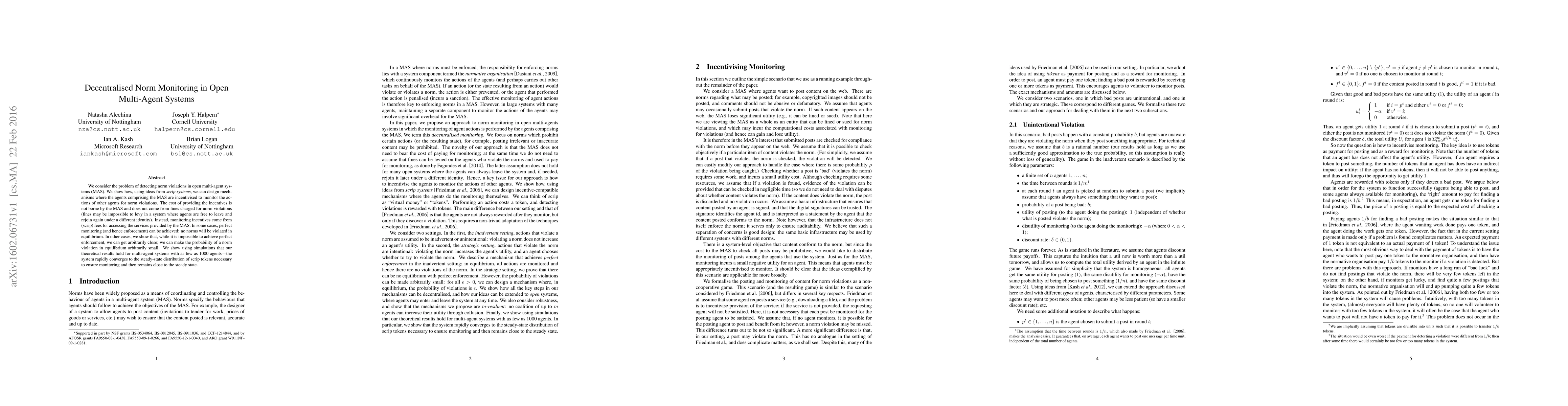 This paper explores decentralized norm monitoring in open multi-agent systems using scrip systems, incentivizing agents to self-monitor each other's actions without relying on fines, instead using fees for accessing system services. The authors demonstrate that perfect norm enforcement can be achieved in equilibrium, or at least the probability of violations can be made arbitrarily small.
