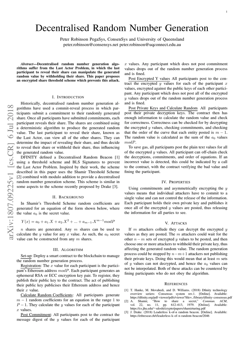 Decentralised random number generation algorithms suffer from the Last Actor Problem, in which the last participant to reveal their share can manipulate the generated random value by withholding their share. This paper proposes an encrypted share threshold scheme which prevents this attack.