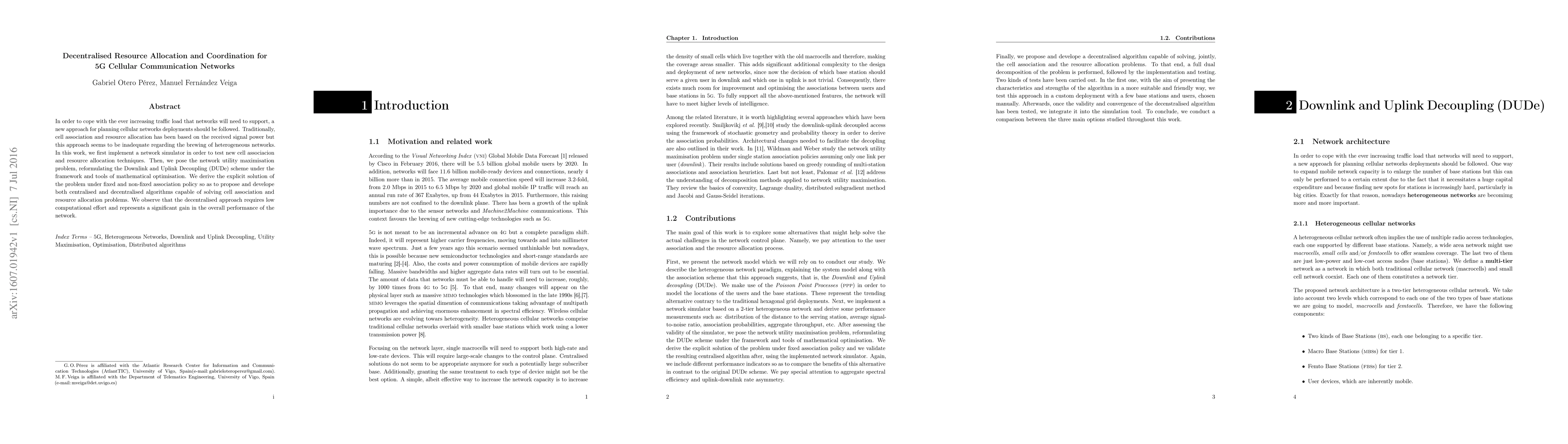 In order to cope with the ever increasing traffic load that networks will need to support, a new approach for planning cellular networks deployments should be followed. Traditionally, cell association and resource allocation has been based on the received signal power but this approach seems to be inadequate regarding the brewing of heterogeneous networks. In this work, we first implement a network simulator in order to test new cell associacion and resource allocation techniques. Then, we pose the network utility maximisation problem, reformulating the Downlink and Uplink Decoupling (DUDe) scheme under the framework and tools of mathematical optimisation. We derive the explicit solution of the problem under fixed and non-fixed association policy so as to propose and develope both centralised and decentralised algorithms capable of solving cell association and resource allocation problems. We observe that the decentralised approach requires low computational effort and represents a significant gain in the overall performance of the network.