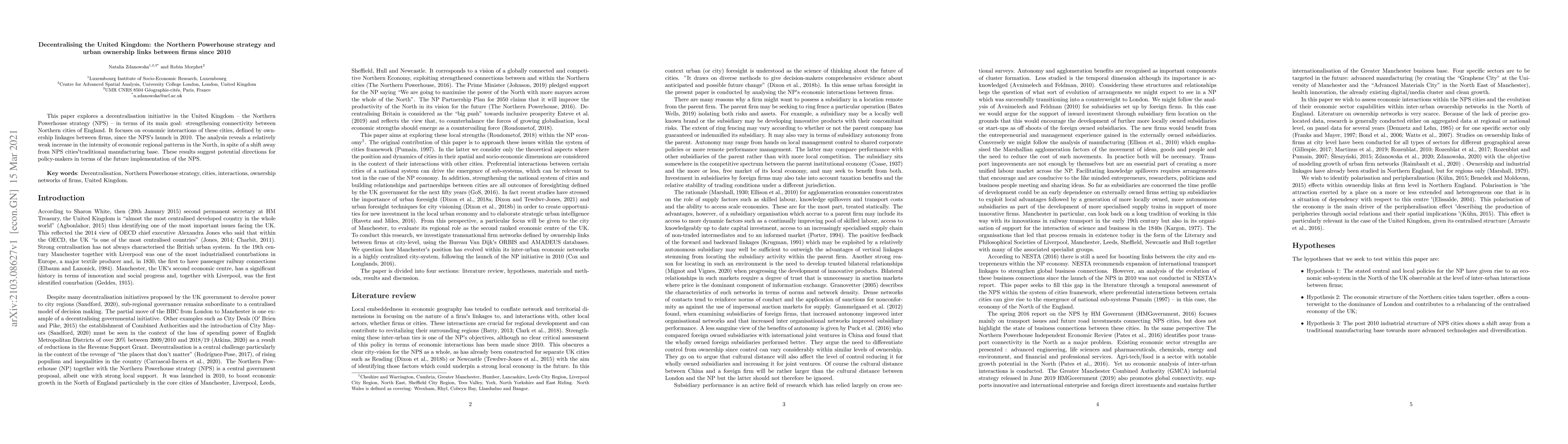 This paper explores a decentralisation initiative in the United Kingdom - the Northern Powerhouse strategy (NPS) - in terms of its main goal: strengthening connectivity between Northern cities of England. It focuses on economic interactions of these cities, defined by ownership linkages between firms, since the NPS's launch in 2010. The analysis reveals a relatively weak increase in the intensity of economic regional patterns in the North, in spite of a shift away from NPS cities' traditional manufacturing base. These results suggest potential directions for policy-makers in terms of the future implementation of the NPS.