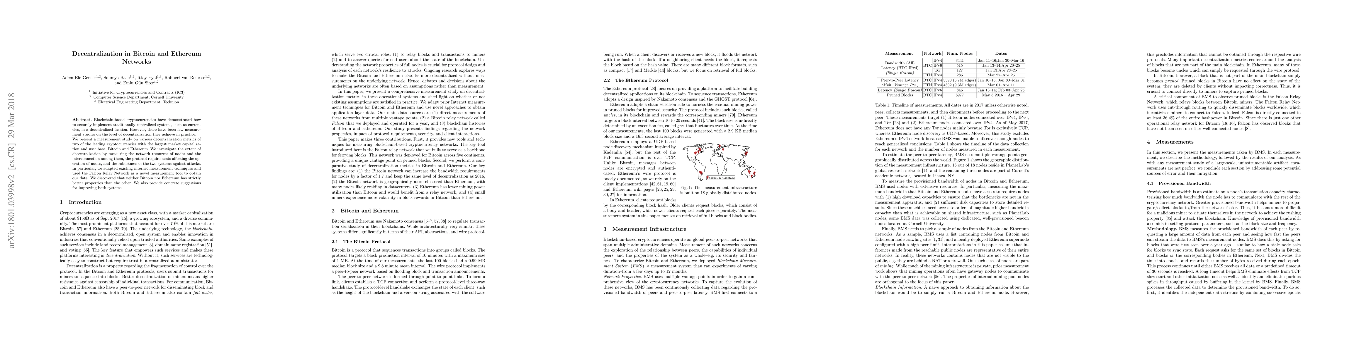 This study measures the decentralization of Bitcoin and Ethereum using various metrics, revealing that neither cryptocurrency has superior decentralization properties. The research suggests improvements for both systems based on findings from network resource analysis and attack robustness.