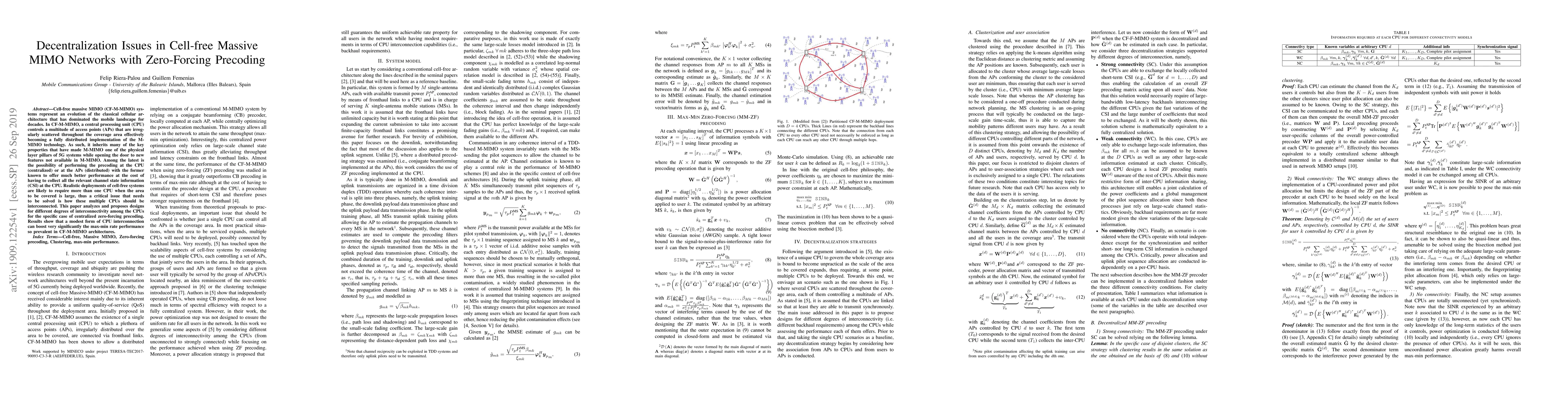 This paper investigates decentralization challenges in cell-free massive MIMO networks employing zero-forcing precoding. It proposes designs for interconnectivity among multiple central processing units to enhance performance, showing that even limited CPU interconnections can substantially improve the max-min rate.