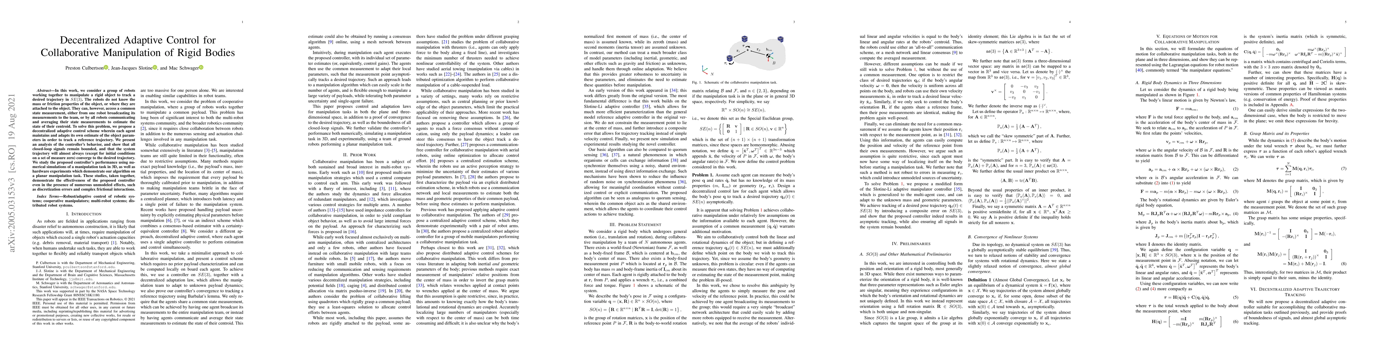 In this work, we consider a group of robots working together to manipulate a rigid object to track a desired trajectory in $SE(3)$. The robots do not know the mass or friction properties of the object, or where they are attached to the object. They can, however, access a common state measurement, either from one robot broadcasting its measurements to the team, or by all robots communicating and averaging their state measurements to estimate the state of their centroid. To solve this problem, we propose a decentralized adaptive control scheme wherein each agent maintains and adapts its own estimate of the object parameters in order to track a reference trajectory. We present an analysis of the controller's behavior, and show that all closed-loop signals remain bounded, and that the system trajectory will almost always (except for initial conditions on a set of measure zero) converge to the desired trajectory. We study the proposed controller's performance using numerical simulations of a manipulation task in 3D, as well as hardware experiments which demonstrate our algorithm on a planar manipulation task. These studies, taken together, demonstrate the effectiveness of the proposed controller even in the presence of numerous unmodeled effects, such as discretization errors and complex frictional interactions.