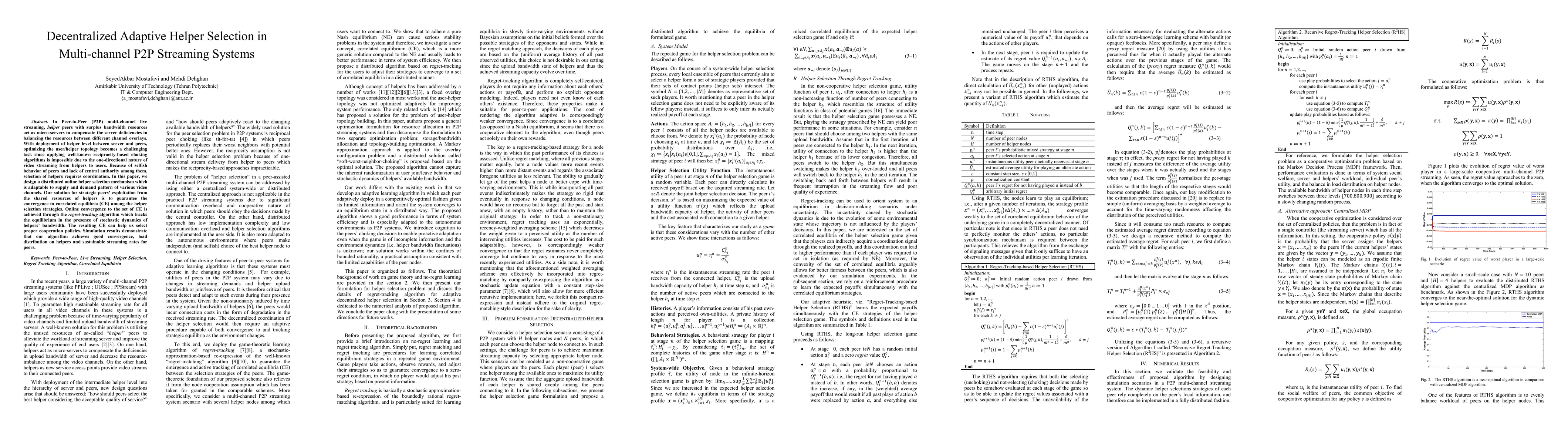 This paper proposes a decentralized adaptive mechanism for selecting helper peers in multi-channel P2P streaming systems to balance resource distribution. The algorithm ensures convergence to correlated equilibria among helper selection strategies using a regret-tracking method, achieving optimal load distribution and sustainable streaming rates.