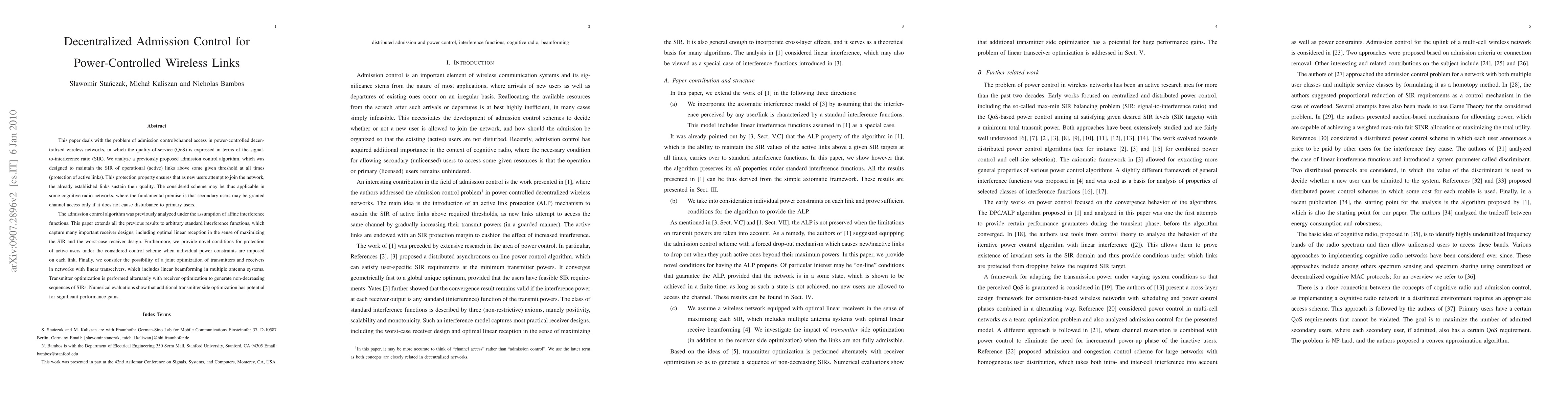 This paper extends an admission control algorithm for power-controlled wireless networks to arbitrary interference functions, ensuring active links maintain quality. It also introduces conditions for protecting active users under power constraints and explores joint optimization of transmitters and receivers for performance gains.