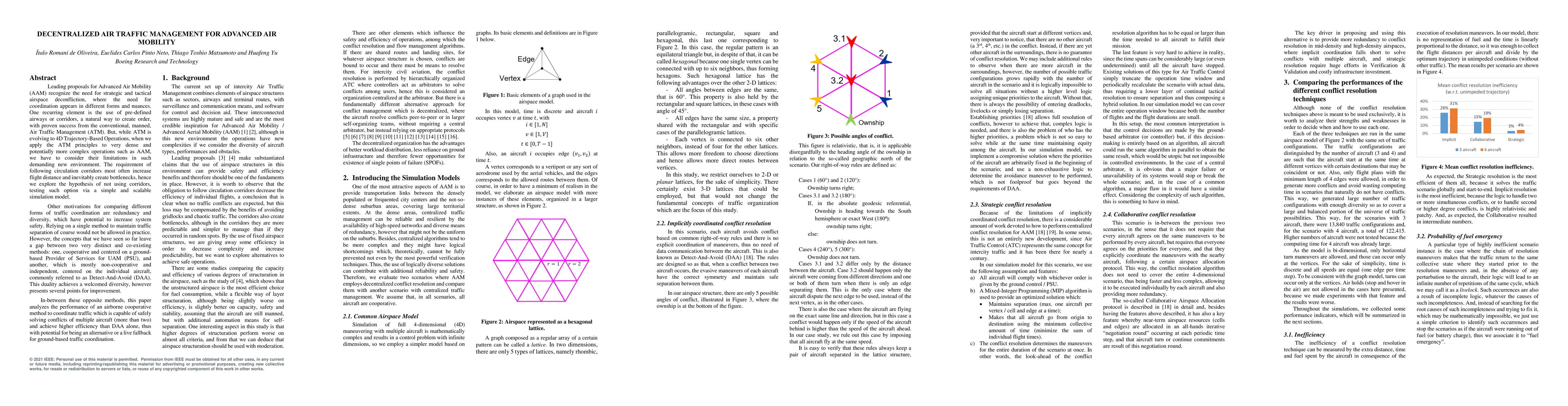Leading proposals for Advanced Air Mobility (AAM) recognize the need for strategic and tactical airspace deconfliction, where the need for coordination appears in different forms and nuances. One recurring element is the use of pre-defined airways or corridors, a natural way to create order, with proven success from the conventional, manned, Air Traffic Management (ATM). But, while ATM is evolving to 4D Trajectory-Based Operations, when we apply the ATM principles to very dense and potentially more complex operations such as AAM, we have to consider their limitations in such demanding new environment. The requirement of following circulation corridors most often increase flight distance and inevitably create bottlenecks, hence we explore the hypothesis of not using corridors, testing such option via a simple and scalable simulation model. Other motivations for comparing different forms of traffic coordination are redundancy and diversity, which have potential to increase system safety. Relying on a single method to maintain traffic separation of course would not be allowed in practice. However, the concepts that we have seen so far leave a gap between two very distinct and co-existing methods: one, cooperative and centered on a ground-based Provider of Services for UAM (PSU), and another, which is mostly non-cooperative and independent, centered on the individual aircraft, commonly referred to as Detect-And-Avoid (DAA). This duality achieves a welcomed diversity, however presents several points for improvement. In-between these opposite methods, this paper analyzes the performance of an airborne cooperative method to coordinate traffic which is capable of safely solving conflicts of multiple aircraft (more than two) and achieve higher efficiency than DAA alone, thus with potential for being an alternative or a live fallback for ground-based traffic coordination.