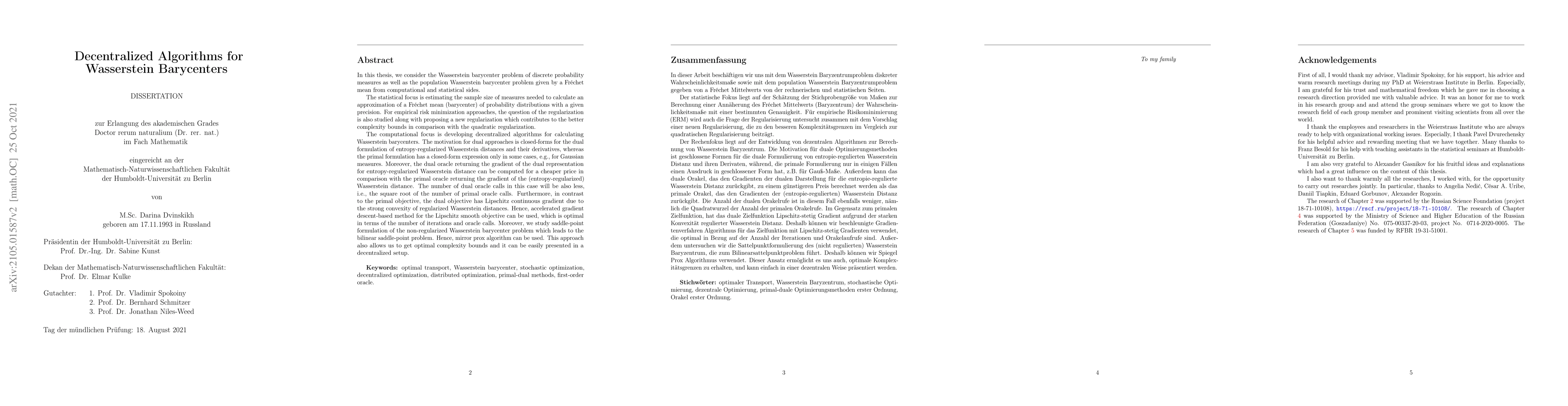 In this thesis, we consider the Wasserstein barycenter problem of discrete probability measures from computational and statistical sides. The statistical focus is estimating the sample size of measures necessary to calculate an approximation for Fr\'echet mean (barycenter) of a probability distribution with a given precision. For empirical risk minimization approaches, the question of the regularization is also studied together with proposing a new regularization which contributes to the better complexity bounds in comparison with quadratic regularization. The computational focus is developing algorithms for calculating Wasserstein barycenters: both primal and dual algorithms which can be executed in a decentralized manner. The motivation for dual approaches is closed-forms for the dual formulation of entropy-regularized Wasserstein distances and their derivatives, whereas the primal formulation has closed-form expression only in some cases, e.g., for Gaussian measures. Moreover, the dual oracle returning the gradient of the dual representation for entropy-regularized Wasserstein distance can be computed for a cheaper price in comparison with the primal oracle returning the gradient of the entropy-regularized Wasserstein distance. The number of dual oracle calls, in this case, will also be less, i.e., the square root of the number of primal oracle calls. This explains the successful application of the first-order dual approaches for the Wasserstein barycenter problem.