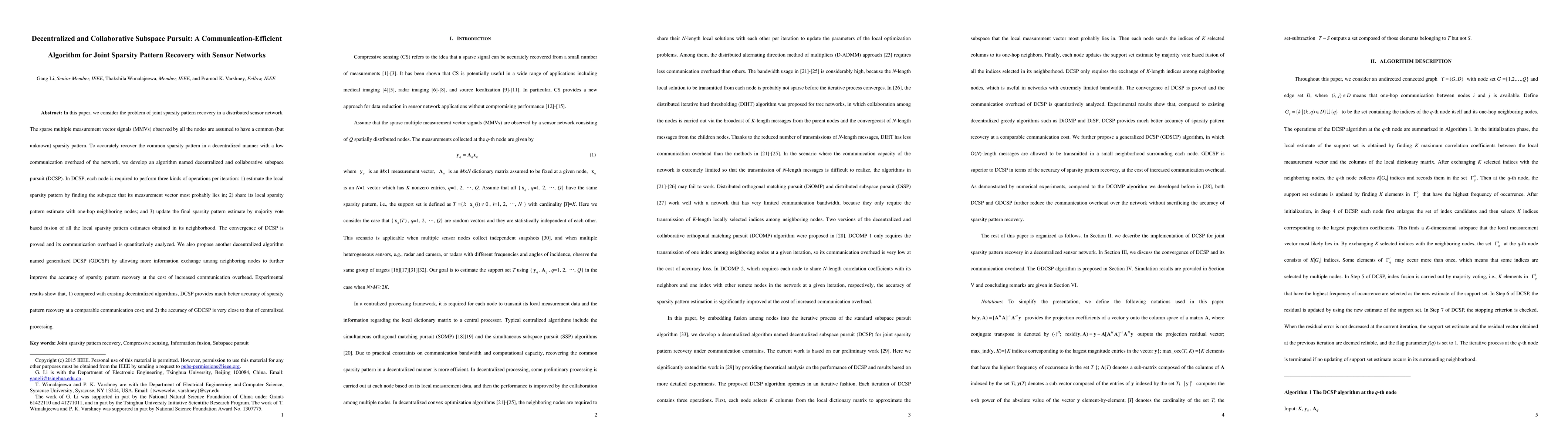 This paper introduces a decentralized and collaborative subspace pursuit (DCSP) algorithm for joint sparsity pattern recovery in distributed sensor networks, achieving high accuracy with low communication overhead. It also presents a generalized version (GDCSP) that enhances accuracy at a higher communication cost, demonstrating superior performance compared to existing decentralized methods.
