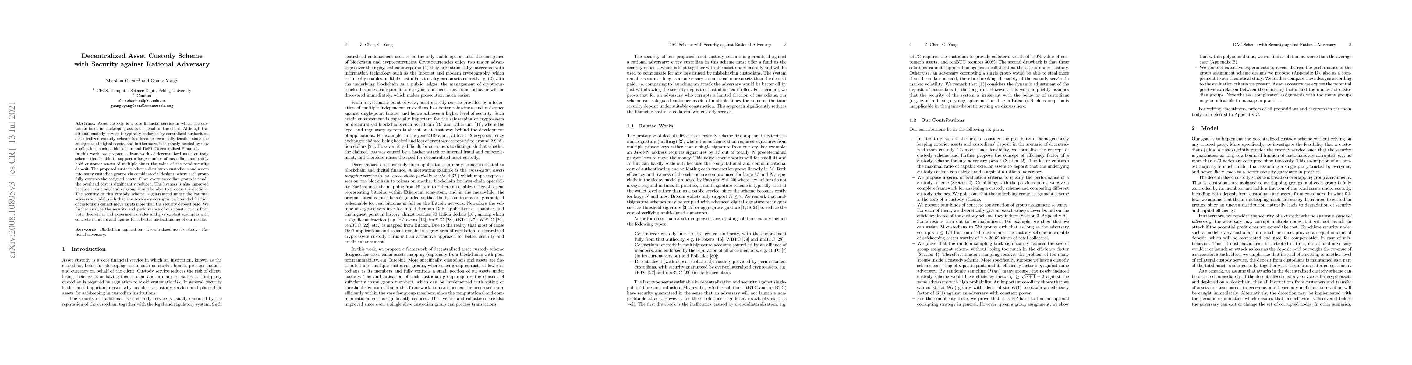 Asset custody is a core financial service in which the custodian holds in-safekeeping assets on behalf of the client. Although traditional custody service is typically endorsed by centralized authorities, decentralized custody scheme has become technically feasible since the emergence of digital assets, and furthermore, it is greatly needed by new applications such as blockchain and DeFi (Decentralized Finance). In this work, we propose a framework of decentralized asset custody scheme that is able to support a large number of custodians and safely hold customer assets of multiple times the value of the total security deposit. The proposed custody scheme distributes custodians and assets into many custodian groups via combinatorial designs, where each group fully controls the assigned assets. Since every custodian group is small, the overhead cost is significantly reduced. The liveness is also improved because even a single alive group would be able to process transactions. The security of this custody scheme is guaranteed under the rational adversary model, such that any adversary corrupting a bounded fraction of custodians cannot move assets more than the security deposit paid. We further analyze the security and performance of our constructions from both theoretical and experimental sides and give explicit examples with concrete numbers and figures for a better understanding of our results.