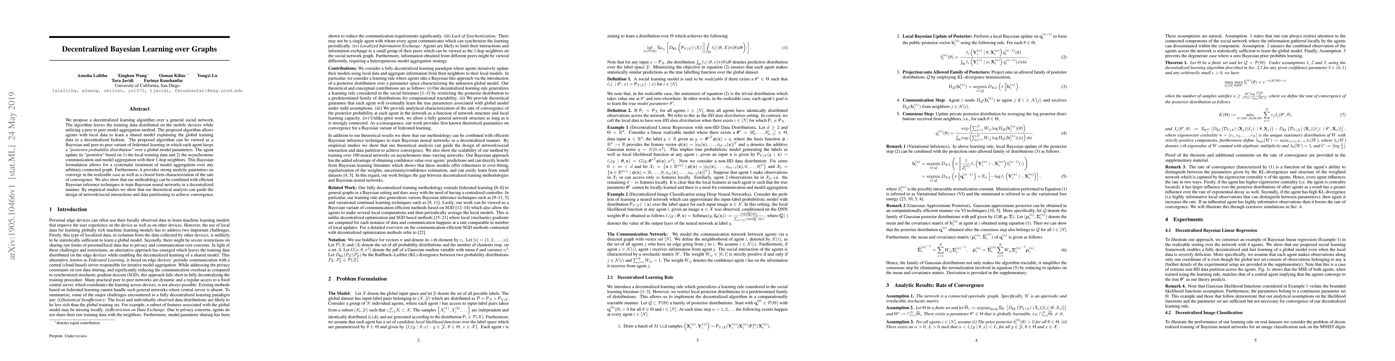 We propose a decentralized learning algorithm over a general social network. The algorithm leaves the training data distributed on the mobile devices while utilizing a peer to peer model aggregation method. The proposed algorithm allows agents with local data to learn a shared model explaining the global training data in a decentralized fashion. The proposed algorithm can be viewed as a Bayesian and peer-to-peer variant of federated learning in which each agent keeps a "posterior probability distribution" over a global model parameters. The agent update its "posterior" based on 1) the local training data and 2) the asynchronous communication and model aggregation with their 1-hop neighbors. This Bayesian formulation allows for a systematic treatment of model aggregation over any arbitrary connected graph. Furthermore, it provides strong analytic guarantees on converge in the realizable case as well as a closed form characterization of the rate of convergence. We also show that our methodology can be combined with efficient Bayesian inference techniques to train Bayesian neural networks in a decentralized manner. By empirical studies we show that our theoretical analysis can guide the design of network/social interactions and data partitioning to achieve convergence.