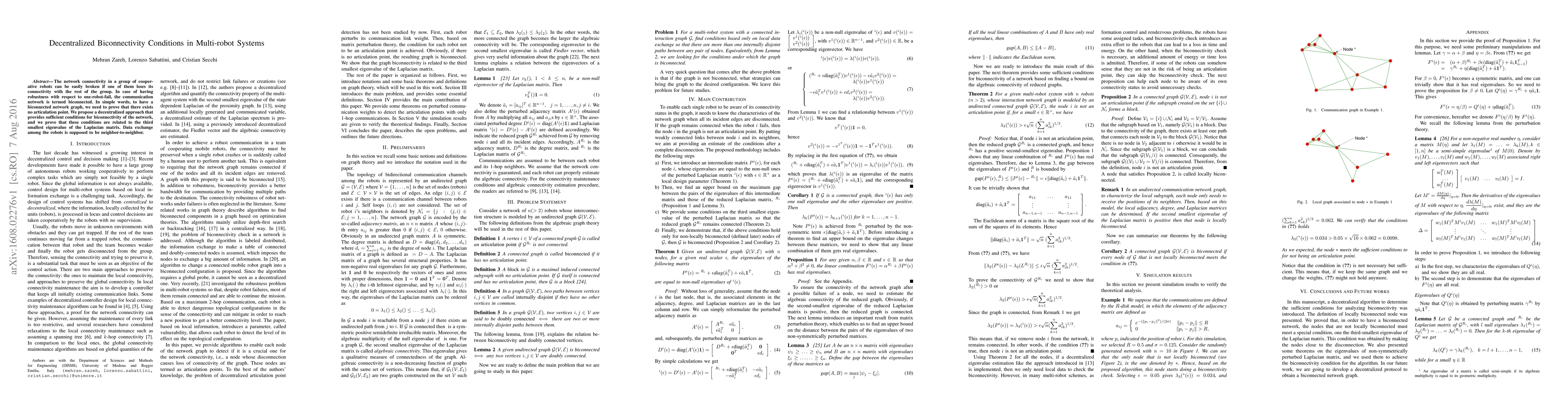 Researchers develop a decentralized approach to ensure network biconnectivity in multi-robot systems, linking third smallest eigenvalue of Laplacian matrix to sufficient conditions for robustness against robot failure.