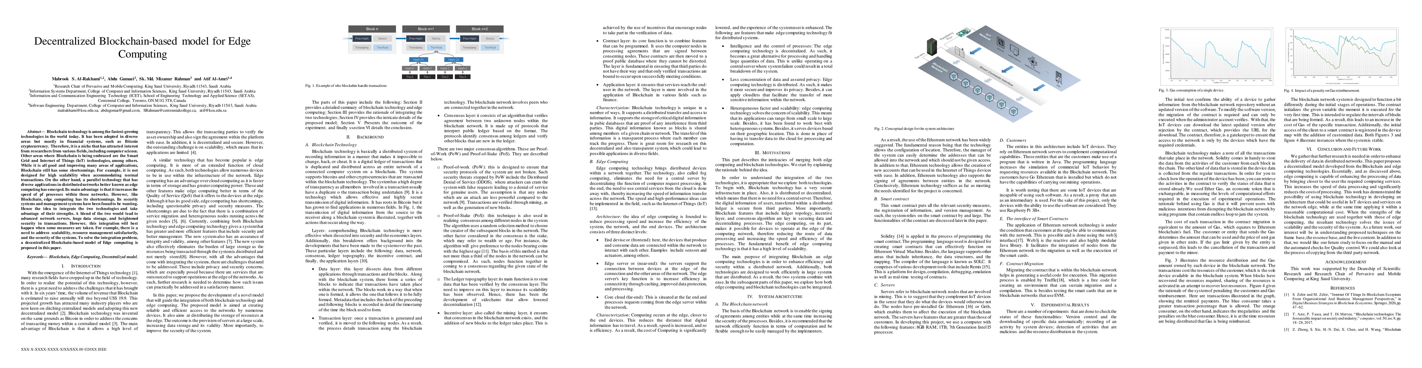 A decentralized blockchain-based model for Edge Computing is proposed to address scalability, security, and resource management issues, enabling advanced network servers, huge data storage, and heightened security in transactions.