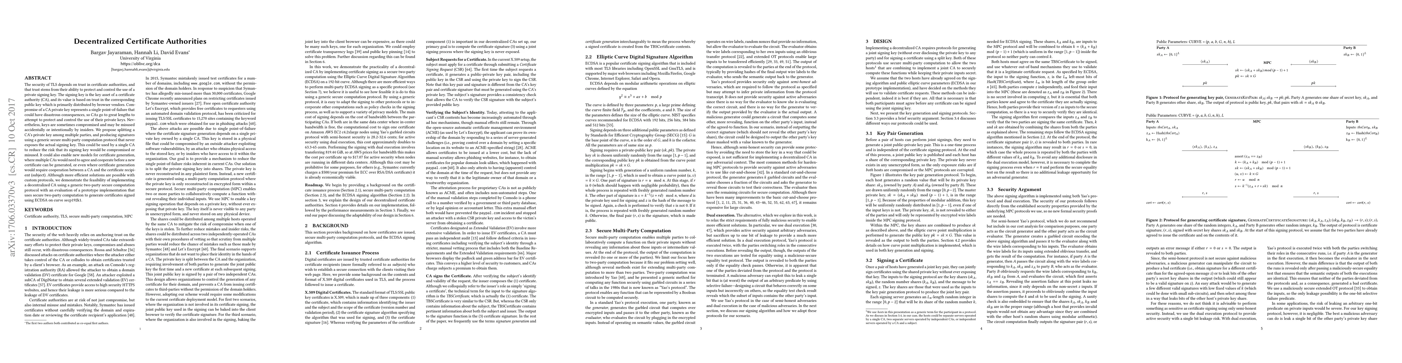 This paper proposes a decentralized approach to certificate authorities (CAs) by splitting a CA's private key among multiple parties, reducing the risk of a single point-of-failure. It demonstrates a prototype implementation using secure two-party computation to generate ECDSA signatures, showcasing the feasibility of this decentralized model.