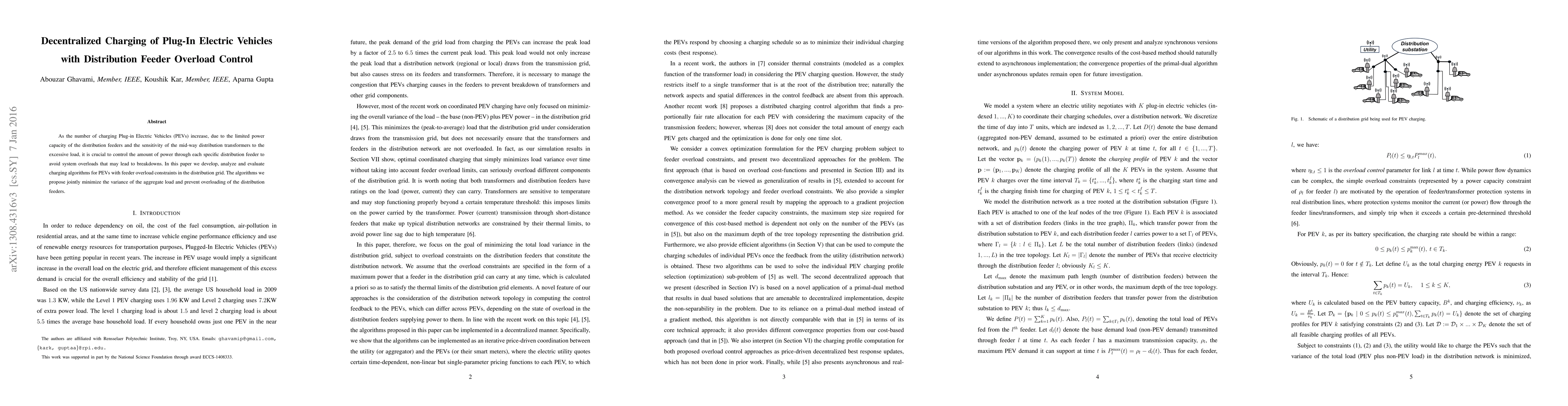 This paper develops charging algorithms for Plug-In Electric Vehicles (PEVs) that minimize aggregate load variance and prevent distribution feeder overloads. The proposed algorithms aim to optimize charging to avoid system breakdowns due to excessive load on distribution feeders.