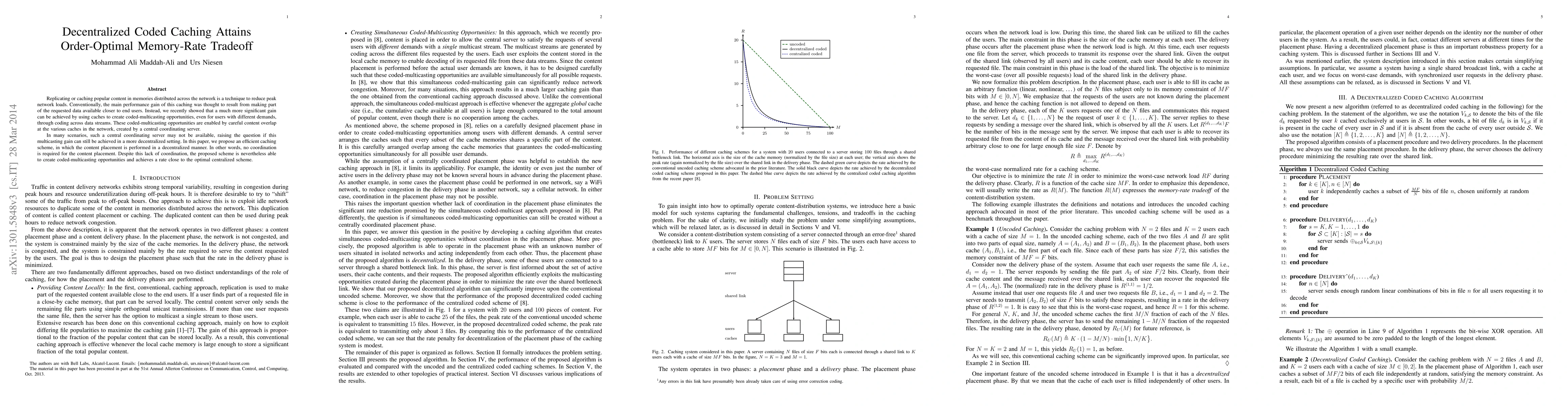 This paper proposes a decentralized caching scheme that achieves near-optimal memory-rate tradeoffs without central coordination, leveraging coded-multicasting to significantly reduce peak network loads by creating efficient content overlap across distributed caches.