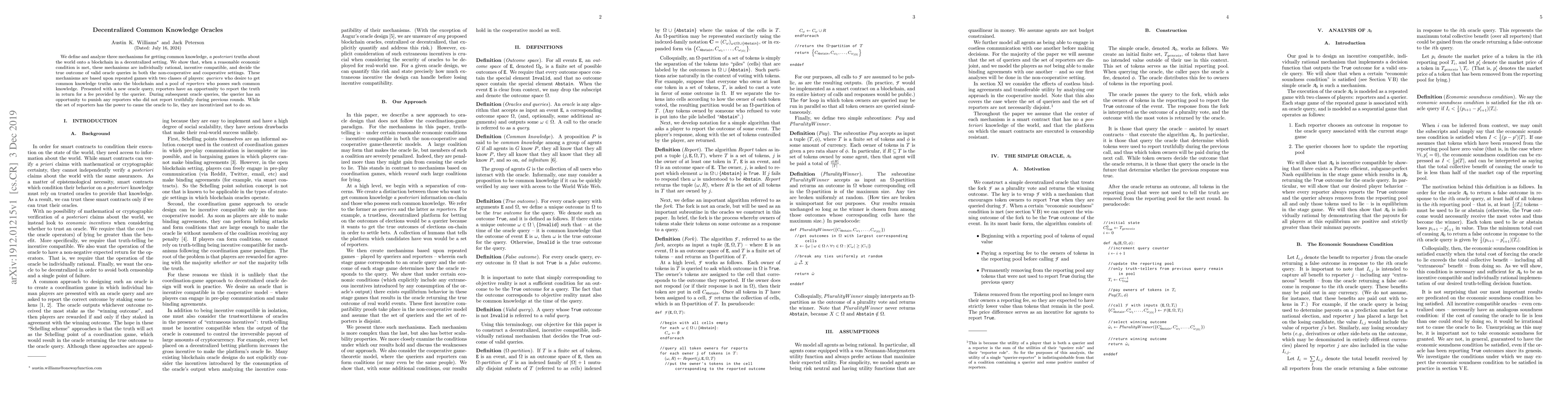 We define and analyze three mechanisms for getting common knowledge, a posteriori truths about the world onto a blockchain in a decentralized setting. We show that, when a reasonable economic condition is met, these mechanisms are individually rational, incentive compatible, and decide the true outcome of valid oracle queries in both the non-cooperative and cooperative settings. These mechanisms are based upon repeated games with two classes of players: queriers who desire to get common knowledge truths onto the blockchain and a pool of reporters who posses such common knowledge. Presented with a new oracle query, reporters have an opportunity to report the truth in return for a fee provided by the querier. During subsequent oracle queries, the querier has an opportunity to punish any reporters who did not report truthfully during previous rounds. While the set of reporters has the power to cause the oracle to lie, they are incentivized not to do so.