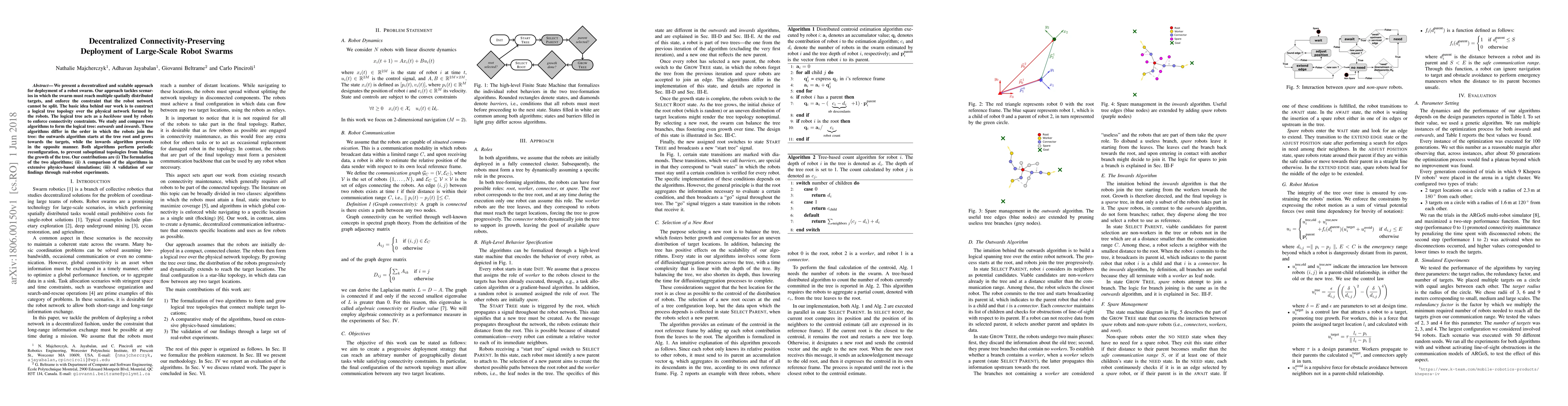 This paper proposes decentralized algorithms for deploying large-scale robot swarms while maintaining network connectivity. It introduces two algorithms, outwards and inwards, to construct a logical tree topology that ensures connectivity, and validates the methods through simulations and real-robot experiments.