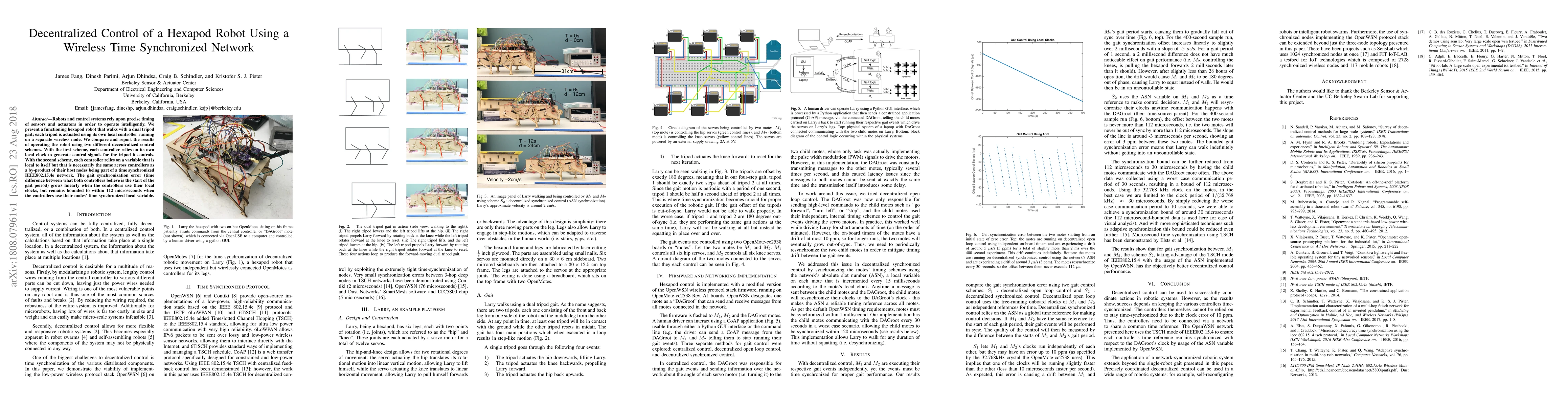 This paper explores decentralized control of a hexapod robot using wireless time synchronization. It compares two control schemes: one using local clocks and another using a synchronized variable across nodes, showing that the latter maintains synchronization within 112 microseconds.