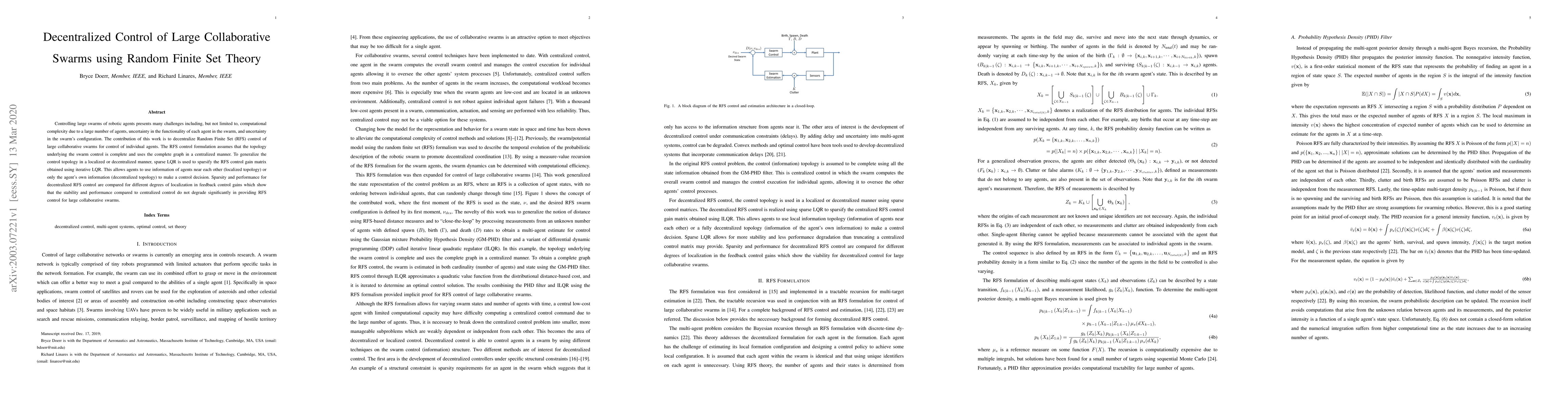 Controlling large swarms of robotic agents presents many challenges including, but not limited to, computational complexity due to a large number of agents, uncertainty in the functionality of each agent in the swarm, and uncertainty in the swarm's configuration. The contribution of this work is to decentralize Random Finite Set (RFS) control of large collaborative swarms for control of individual agents. The RFS control formulation assumes that the topology underlying the swarm control is complete and uses the complete graph in a centralized manner. To generalize the control topology in a localized or decentralized manner, sparse LQR is used to sparsify the RFS control gain matrix obtained using iterative LQR. This allows agents to use information of agents near each other (localized topology) or only the agent's own information (decentralized topology) to make a control decision. Sparsity and performance for decentralized RFS control are compared for different degrees of localization in feedback control gains which show that the stability and performance compared to centralized control do not degrade significantly in providing RFS control for large collaborative swarms.