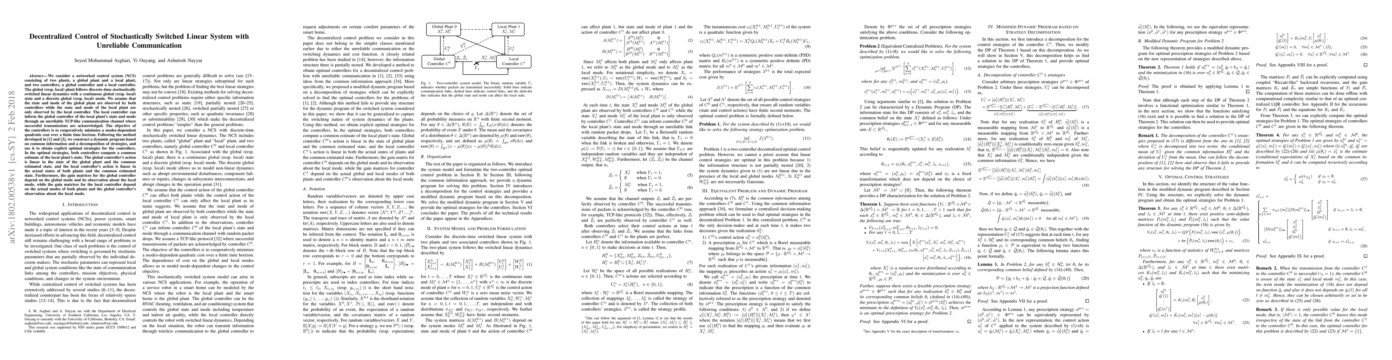 We consider a networked control system (NCS) consisting of two plants, a global plant and a local plant, and two controllers, a global controller and a local controller. The global (resp. local) plant follows discrete-time stochastically switched linear dynamics with a continuous global (resp. local) state and a discrete global (resp. local) mode. We assume that the state and mode of the global plant are observed by both controllers while the state and mode of the local plant are only observed by the local controller. The local controller can inform the global controller of the local plant's state and mode through an unreliable TCP-like communication channel where successful transmissions are acknowledged. The objective of the controllers is to cooperatively minimize a modes-dependent quadratic cost over a finite time horizon. Following the method developed in [1] and [2], we construct a dynamic program based on common information and a decomposition of strategies, and use it to obtain explicit optimal strategies for the controllers. In the optimal strategies, both controllers compute a common estimate of the local plant's state. The global controller's action is linear in the state of the global plant and the common estimated state, and the local controller's action is linear in the actual states of both plants and the common estimated state. Furthermore, the gain matrices for the global controller depend on the global mode and its observation about the local mode, while the gain matrices for the local controller depend on the actual modes of both plants and the global controller's observation about the local mode.