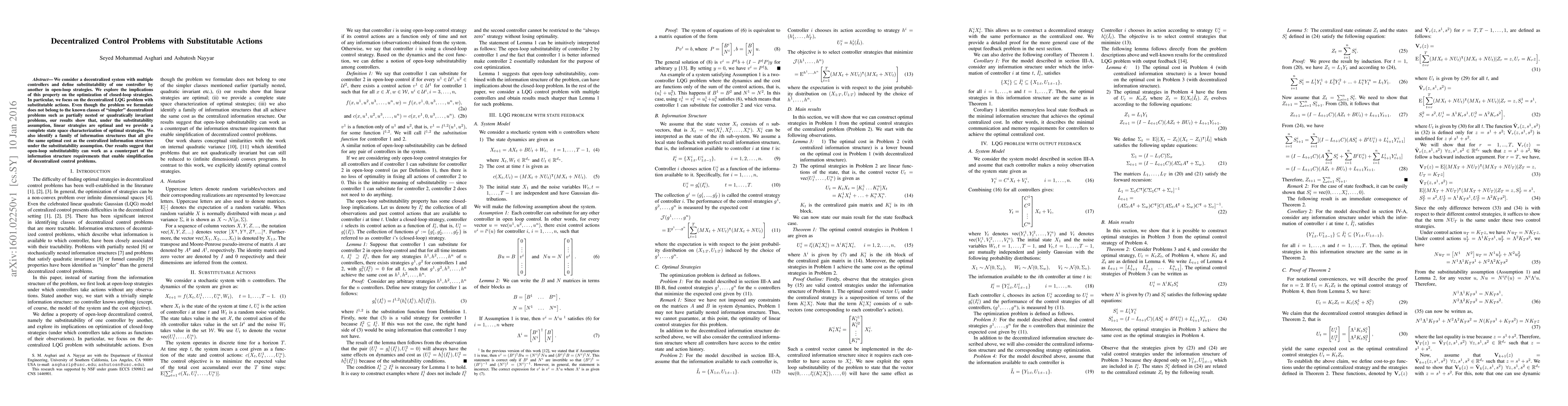 This paper investigates decentralized control problems where controllers' actions can be substituted by others, focusing on the LQG framework. It demonstrates that under substitutability, linear strategies are optimal and provides a complete characterization of these strategies, highlighting that certain information structures yield the same optimal cost as centralized control.
