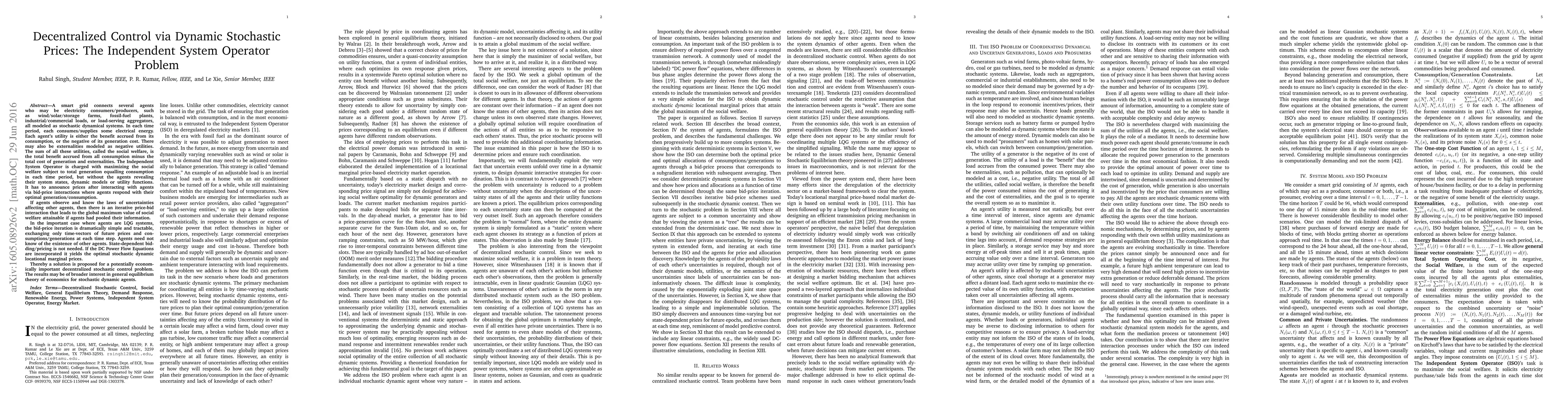 A smart grid connects wind or solar or storage farms, fossil fuel plants, industrialor commercial loads, or load serving entities, modeled as stochastic dynamical systems. In each time period, they consume or supply electrical energy, with the constraint that total generation equals consumption. Each agent's utility is either the benefit accrued from consumption, or negative of generation cost. The Independent System Operator has to maximize their sum, the social welfare, without agents revealing their dynamic models or utilities. It has to announce prices after interacting with agents via bids. If agents observe and know the laws of uncertainties affecting other agents, then there is an iterative price and bid interaction that leads to the maximum social welfare attainable if agents pooled their information. In the important case where agents are LQG systems not even knowing of the existence of other agents, the bid and price iteration is dramatically simple, exchanging time vectors of future prices and consumptions or generations at each time step. State dependent bidding is not needed. This solution of the decentralized stochastic control problem may be of economic importance in power systems, and of broader interest in general equilibrium theory of economics for stochastic dynamic agents.
