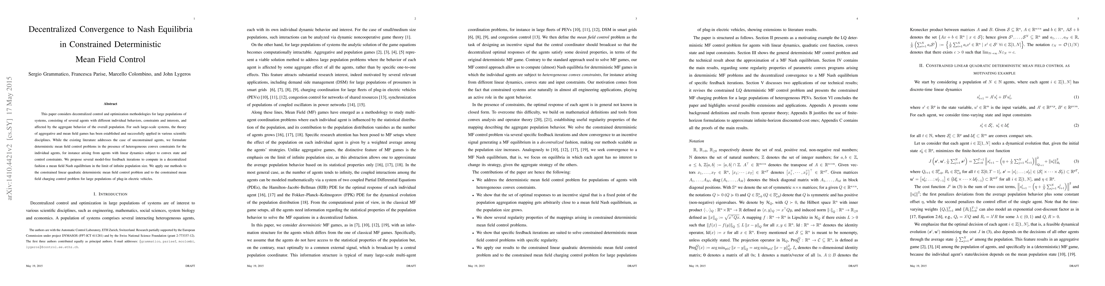 This paper proposes decentralized algorithms to find Nash equilibria in constrained deterministic mean field control problems for large populations with diverse constraints. It applies these methods to linear quadratic and charging control problems for plug-in electric vehicles.