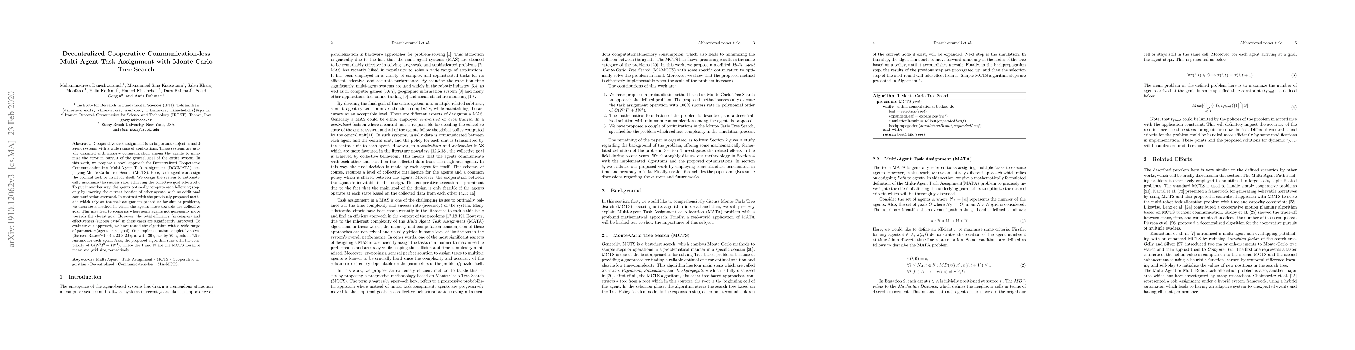 This paper proposes a decentralized cooperative task assignment method for multi-agent systems using Monte-Carlo Tree Search (MCTS) without requiring communication among agents. The approach enables each agent to independently compute optimal task assignments based on current agent locations, significantly improving efficiency and success rates.