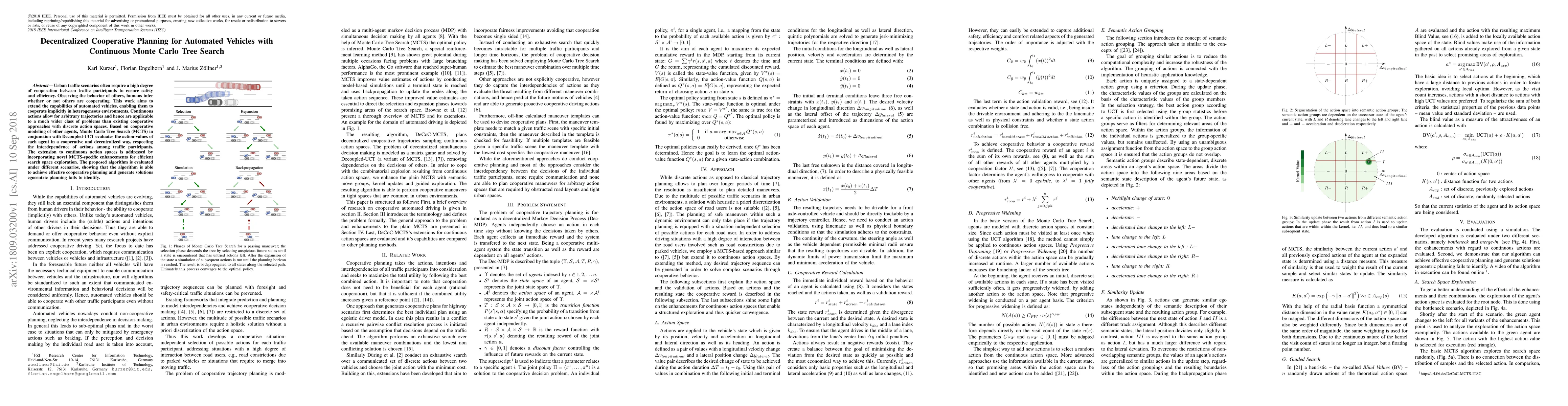 This paper proposes a decentralized cooperative planning method for automated vehicles using continuous Monte Carlo Tree Search (MCTS) and Decoupled-UCT to enable implicit cooperation in urban traffic. The approach efficiently explores continuous action spaces and achieves cooperative planning where egocentric planning falls short.