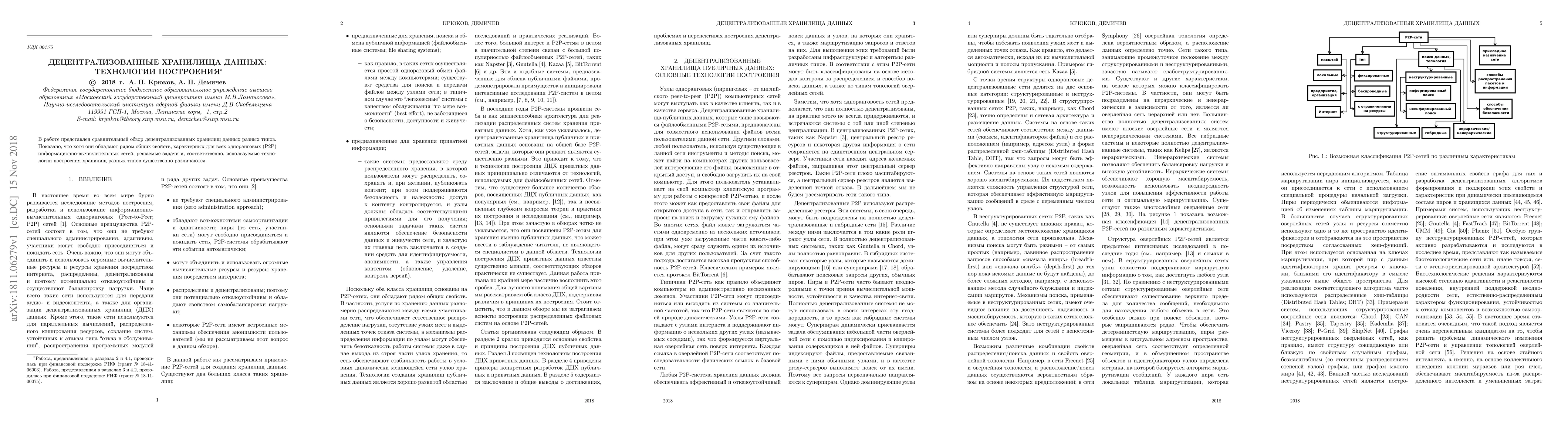 The paper presents a comparative overview of decentralized data storages of various types. It is shown that although they have a number of common properties that are typical of all peer-to-peer (P2P) networks, the problems to be solved and, accordingly, the technologies used to build different types of storages differ significantly.