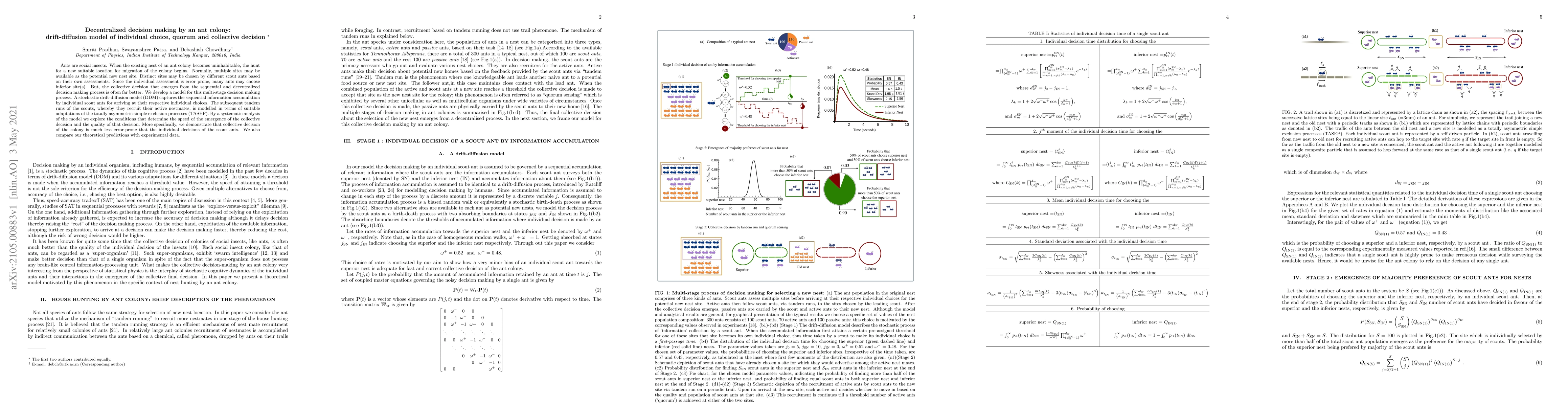 Ants are social insects. When the existing nest of an ant colony becomes uninhabitable, the hunt for a new suitable location for migration of the colony begins. Normally, multiple sites may be available as the potential new nest site. Distinct sites may be chosen by different scout ants based on their own assessments. Since the individual assessment is error prone, many ants may choose inferior site(s). But, the collective decision that emerges from the sequential and decentralized decision making process is often far better. We develop a model for this multi-stage decision making process. A stochastic drift-diffusion model (DDM) captures the sequential information accumulation by individual scout ants for arriving at their respective individual choices. The subsequent tandem runs of the scouts, whereby they recruit their active nestmates, is modelled in terms of suitable adaptations of the totally asymmetric simple exclusion processes (TASEP). By a systematic analysis of the model we explore the conditions that determine the speed of the emergence of the collective decision and the quality of that decision. More specifically, we demonstrate that collective decision of the colony is much less error-prone that the individual decisions of the scout ants. We also compare our theoretical predictions with experimental data.