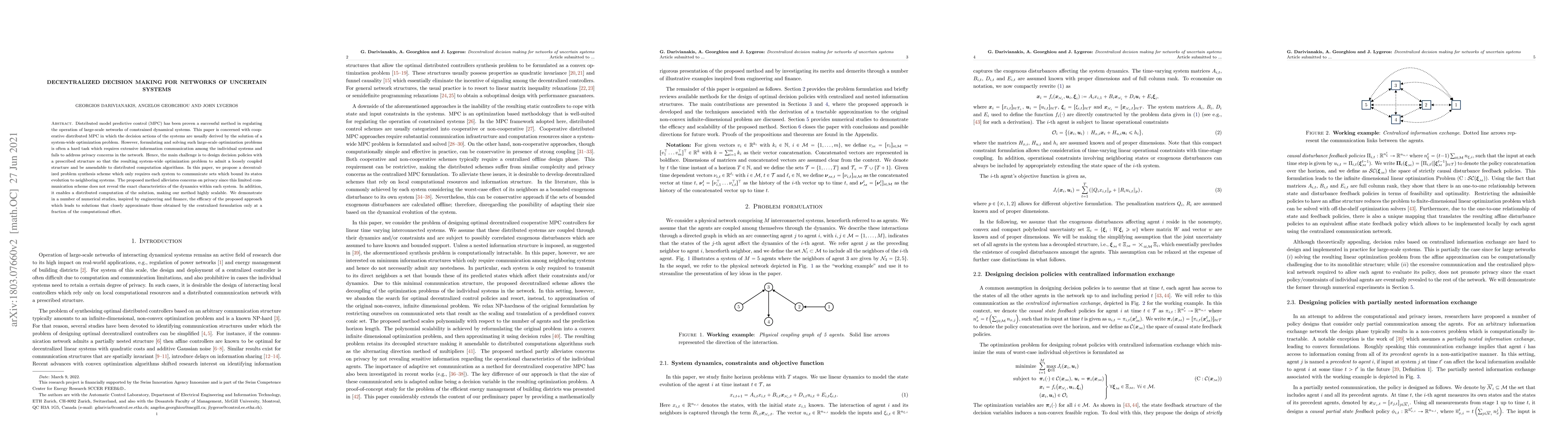 Distributed model predictive control (MPC) has been proven a successful method in regulating the operation of large-scale networks of constrained dynamical systems. This paper is concerned with cooperative distributed MPC in which the decision actions of the systems are usually derived by the solution of a system-wide optimization problem. However, formulating and solving such large-scale optimization problems is often a hard task which requires extensive information communication among the individual systems and fails to address privacy concerns in the network. Hence, the main challenge is to design decision policies with a prescribed structure so that the resulting system-wide optimization problem to admit a loosely coupled structure and be amendable to distributed computation algorithms. In this paper, we propose a decentralized problem synthesis scheme which only requires each system to communicate sets which bound its states evolution to neighboring systems. The proposed method alleviates concerns on privacy since this limited communication scheme does not reveal the exact characteristics of the dynamics within each system. In addition, it enables a distributed computation of the solution, making our method highly scalable. We demonstrate in a number of numerical studies, inspired by engineering and finance, the efficacy of the proposed approach which leads to solutions that closely approximate those obtained by the centralized formulation only at a fraction of the computational effort.
