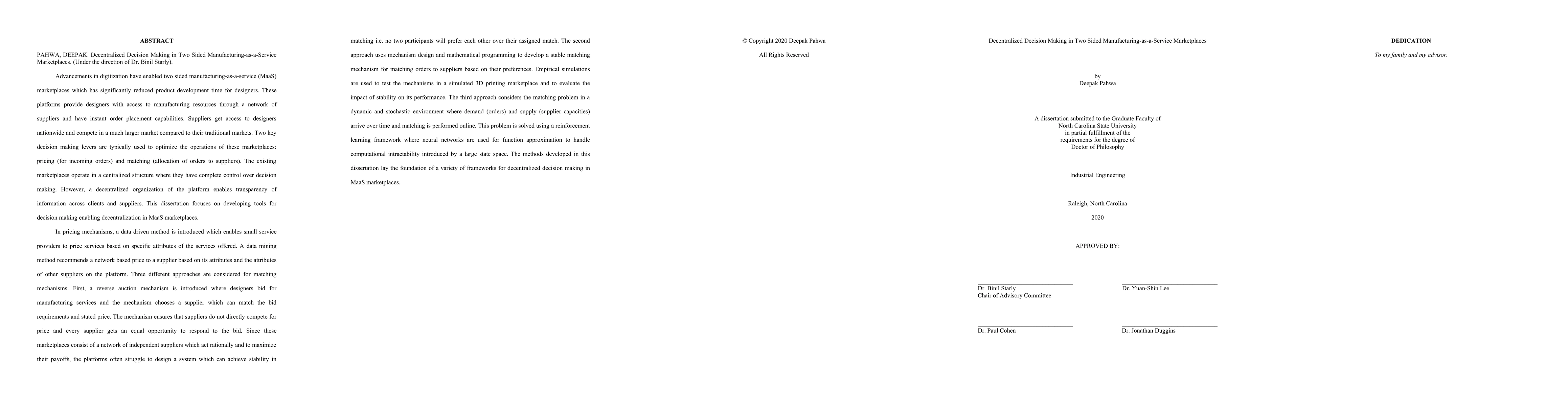 Advancements in digitization have enabled two sided manufacturing-as-a-service (MaaS) marketplaces which has significantly reduced product development time for designers. These platforms provide designers with access to manufacturing resources through a network of suppliers and have instant order placement capabilities. Two key decision making levers are typically used to optimize the operations of these marketplaces: pricing and matching. The existing marketplaces operate in a centralized structure where they have complete control over decision making. However, a decentralized organization of the platform enables transparency of information across clients and suppliers. This dissertation focuses on developing tools for decision making enabling decentralization in MaaS marketplaces. In pricing mechanisms, a data driven method is introduced which enables small service providers to price services based on specific attributes of the services offered. A data mining method recommends a network based price to a supplier based on its attributes and the attributes of other suppliers on the platform. Three different approaches are considered for matching mechanisms. First, a reverse auction mechanism is introduced where designers bid for manufacturing services and the mechanism chooses a supplier which can match the bid requirements and stated price. The second approach uses mechanism design and mathematical programming to develop a stable matching mechanism for matching orders to suppliers based on their preferences. Empirical simulations are used to test the mechanisms in a simulated 3D printing marketplace and to evaluate the impact of stability on its performance. The third approach considers the matching problem in a dynamic and stochastic environment where demand (orders) and supply (supplier capacities) arrive over time and matching is performed online.