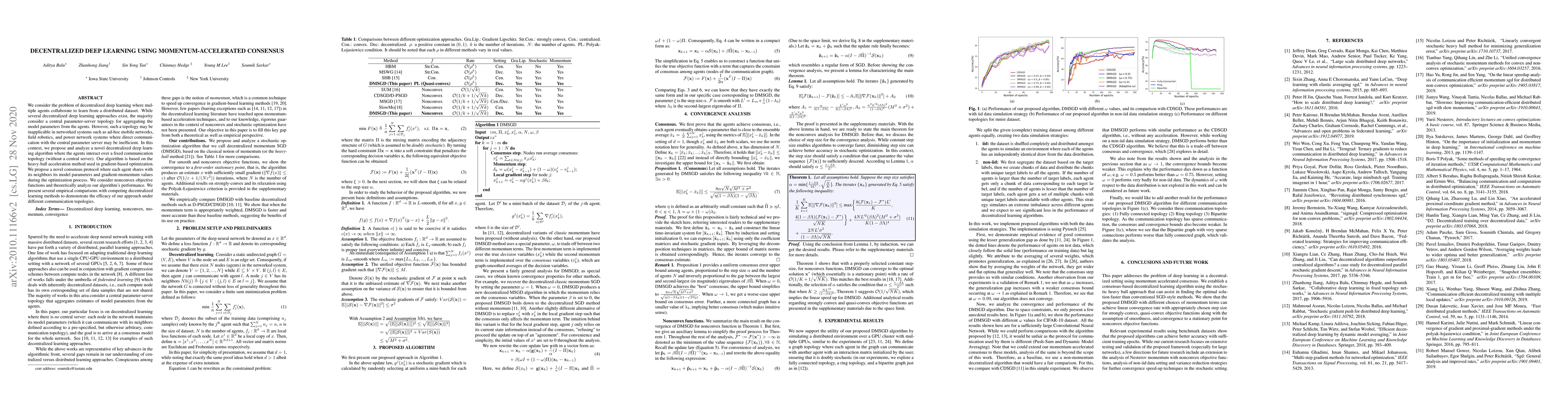 This paper proposes a decentralized deep learning algorithm that enables multiple agents to learn collaboratively without a central parameter server, using a consensus protocol based on heavy-ball acceleration. The method shares model parameters and gradient-momentum values among neighbors, and is theoretically analyzed for both convex and non-convex objectives, with empirical comparisons showing its effectiveness.