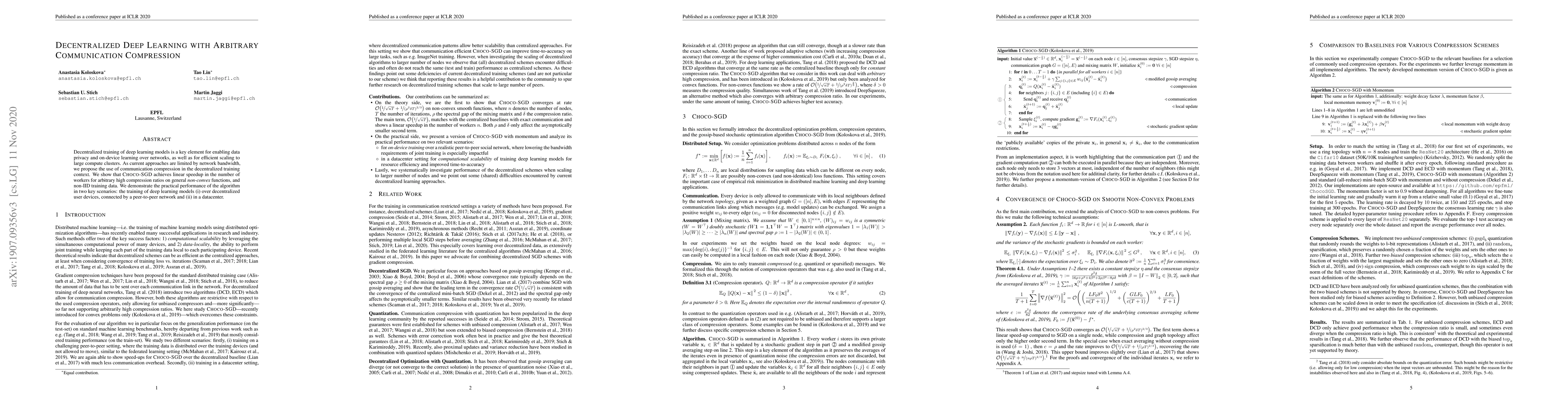 This paper proposes a decentralized deep learning method using communication compression to enhance scalability and data privacy. The Choco-SGD algorithm achieves convergence under high compression ratios for non-convex functions, demonstrating linear speedup with more workers and outperforming previous methods in distributed training scenarios.