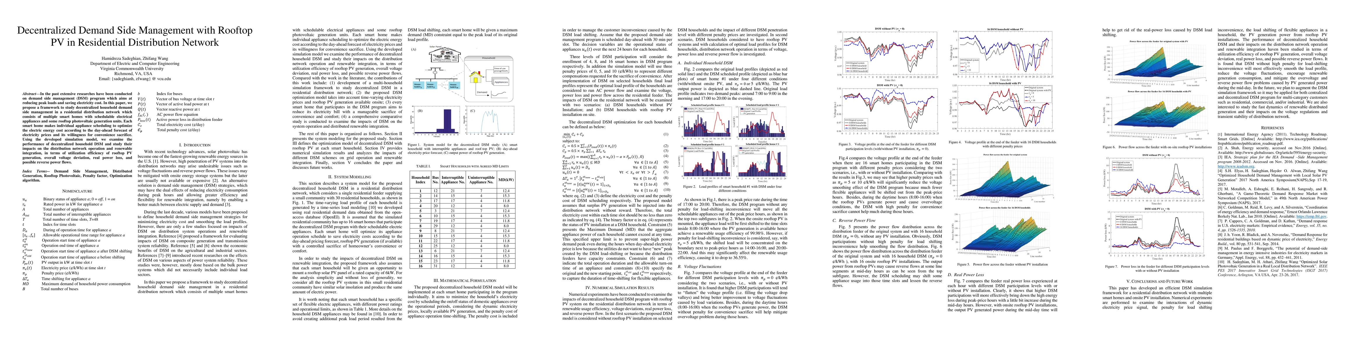 The paper presents a multi-household simulation framework for decentralized DSM, incorporating time-varying electricity prices and onsite PV generation, with each smart home optimizing its appliance schedule to minimize electricity costs while managing customer convenience sacrifice.