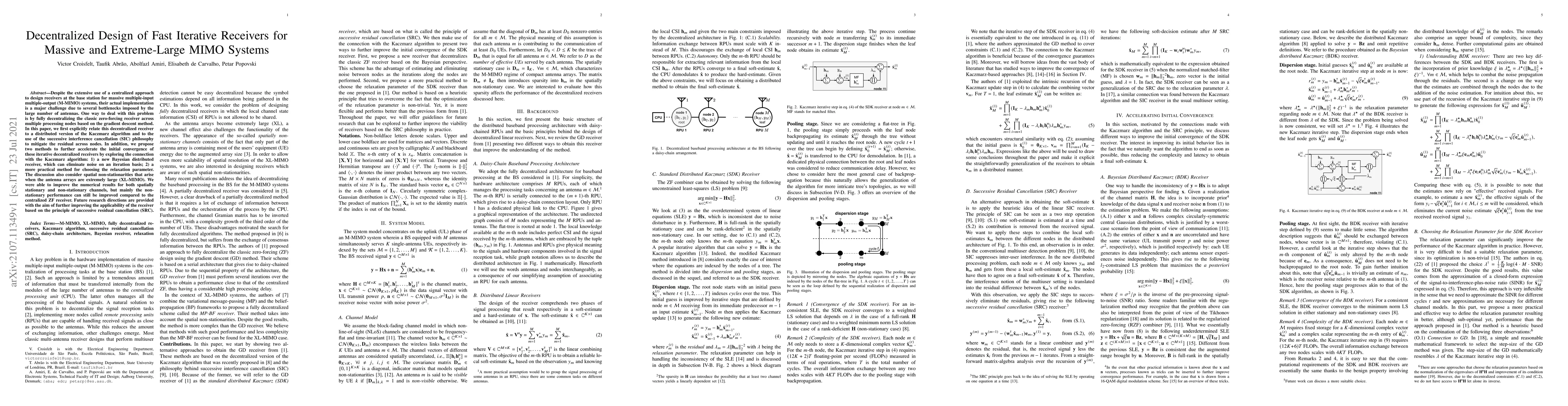 Despite the extensive use of a centralized approach to design receivers at the base station for massive multiple-input multiple-output (M-MIMO) systems, their actual implementation is a major challenge due to several bottlenecks imposed by the large number of antennas. One way to deal with this problem is by fully decentralizing the classic zero-forcing receiver across multiple processing nodes based on the gradient descent method. In this paper, we first explicitly relate this decentralized receiver to a distributed version of the Kaczmarz algorithm and to the use of the successive interference cancellation (SIC) philosophy to mitigate the residual across nodes. In addition, we propose two methods to further accelerate the initial convergence of these iterative decentralized receivers by exploring the connection with the Kaczmarz algorithm: 1) a new Bayesian distributed receiver, which can eliminate noise on an iteration basis; 2) a more practical method for choosing the relaxation parameter. The discussion also consider spatial non-stationarities that arise when the antenna arrays are extremely large (XL-MIMO). We were able to improve the numerical results for both spatially stationary and non-stationary channels, but mainly the non-stationary performance can still be improved compared to the centralized ZF receiver. Future research directions are provided with the aim of further improving the applicability of the receiver based on the principle of successive residual cancellation (SRC).