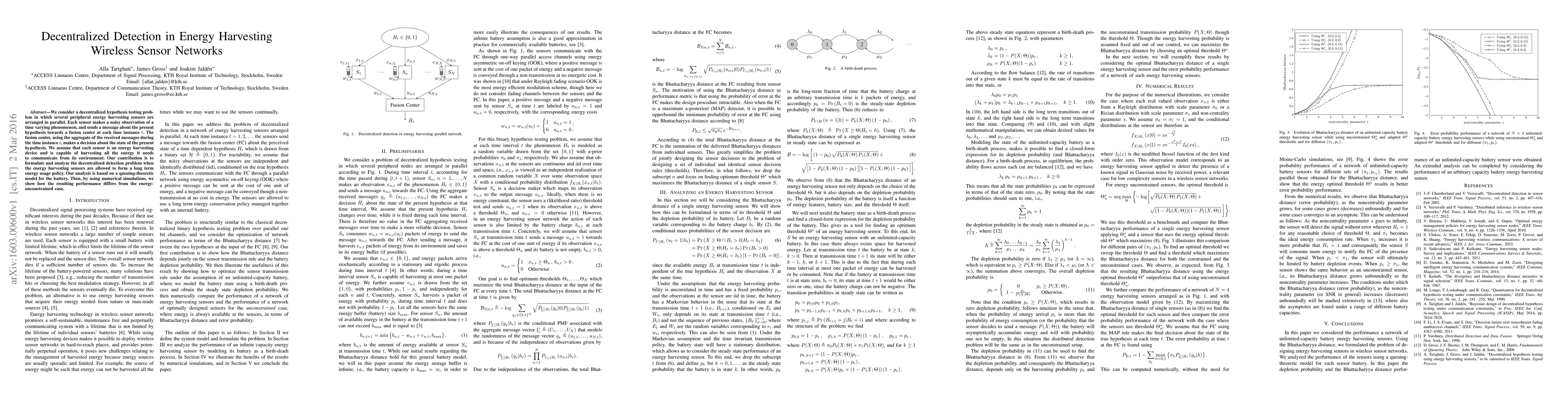 We consider a decentralized hypothesis testing problem in which several peripheral energy harvesting sensors are arranged in parallel. Each sensor makes a noisy observation of a time varying phenomenon, and sends a message about the present hypothesis towards a fusion center at each time instance t. The fusion center, using the aggregate of the received messages during the time instance t, makes a decision about the state of the present hypothesis. We assume that each sensor is an energy harvesting device and is capable of harvesting all the energy it needs to communicate from its environment. Our contribution is to formulate and analyze the decentralized detection problem when the energy harvesting sensors are allowed to form a long term energy usage policy. Our analysis is based on a queuing-theoretic model for the battery. Then, by using numerical simulations, we show how the resulting performance differs from the energy unconstrained case.
