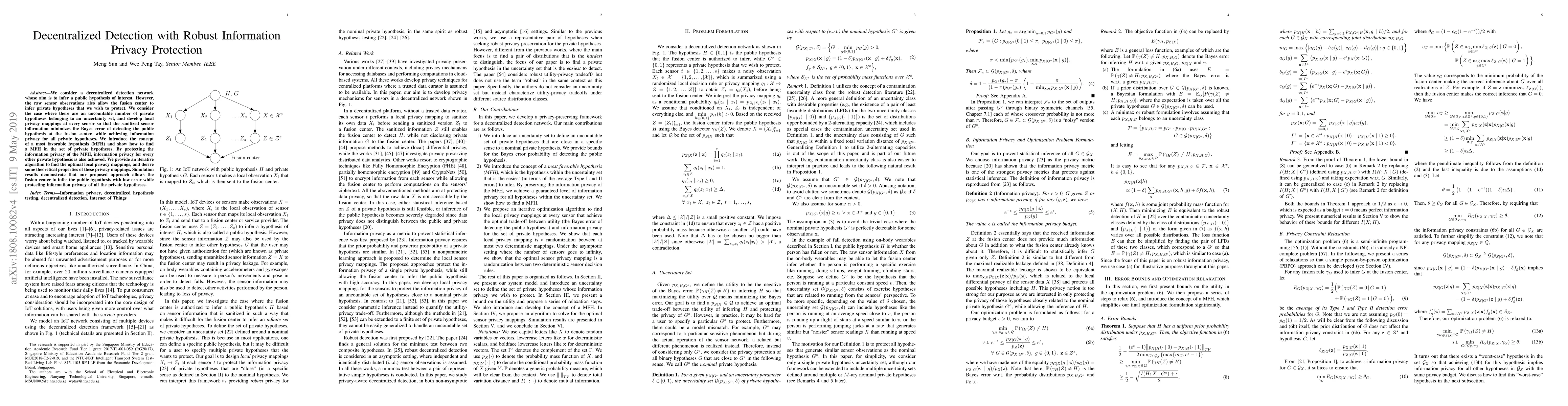 Researchers develop a decentralized detection network that protects private hypotheses while minimizing Bayes error in detecting a public hypothesis. The approach uses local privacy mappings to achieve this balance.