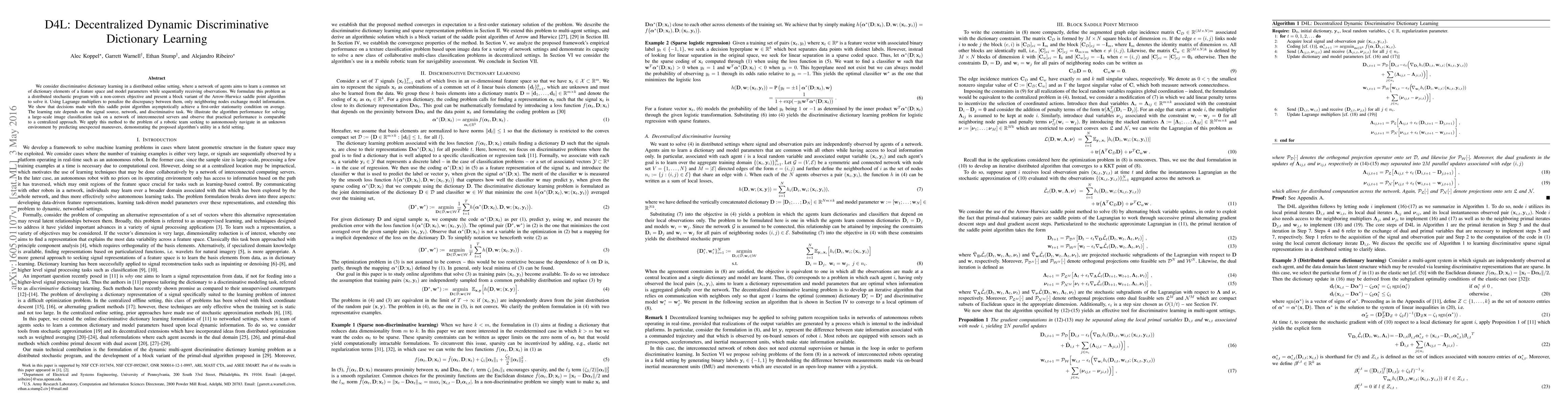 We consider discriminative dictionary learning in a distributed online setting, where a network of agents aims to learn a common set of dictionary elements of a feature space and model parameters while sequentially receiving observations. We formulate this problem as a distributed stochastic program with a non-convex objective and present a block variant of the Arrow-Hurwicz saddle point algorithm to solve it. Using Lagrange multipliers to penalize the discrepancy between them, only neighboring nodes exchange model information. We show that decisions made with this saddle point algorithm asymptotically achieve a first-order stationarity condition on average.