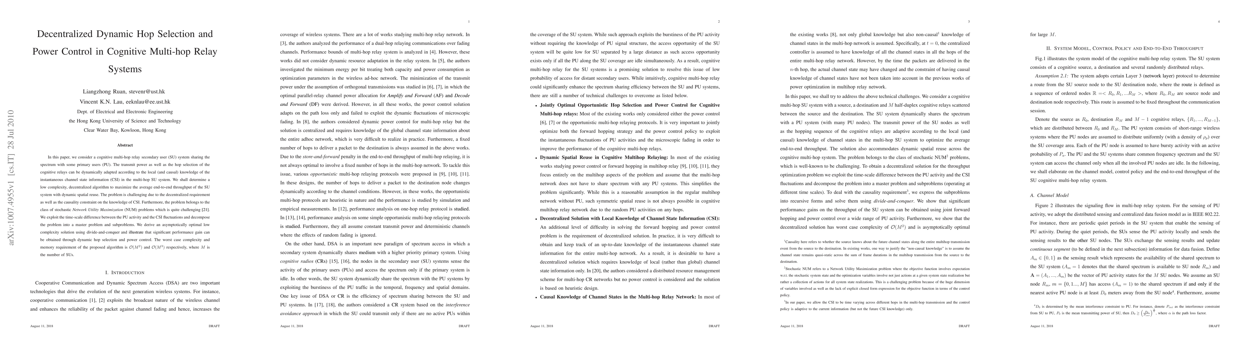 This paper proposes a decentralized, low-complexity algorithm for cognitive multi-hop relay systems to dynamically adapt transmit power and hop selection based on local channel state information, aiming to maximize average throughput. The algorithm leverages time-scale differences between primary users and channel fluctuations, achieving significant performance gains with manageable complexity.