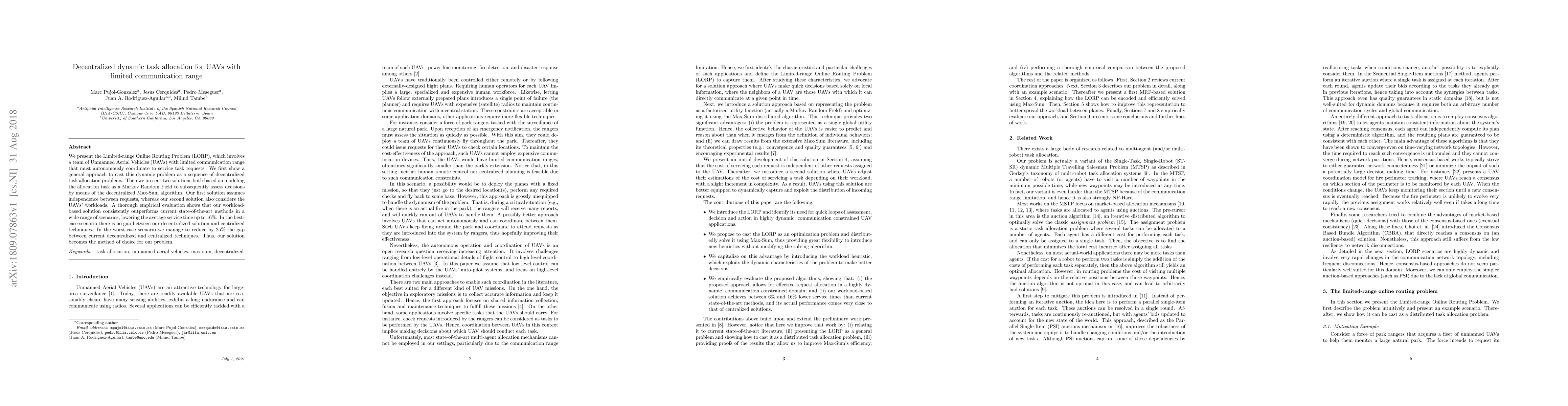 Researchers developed a decentralized task allocation system for UAVs with limited communication range, achieving performance improvements of up to 16% compared to existing methods.