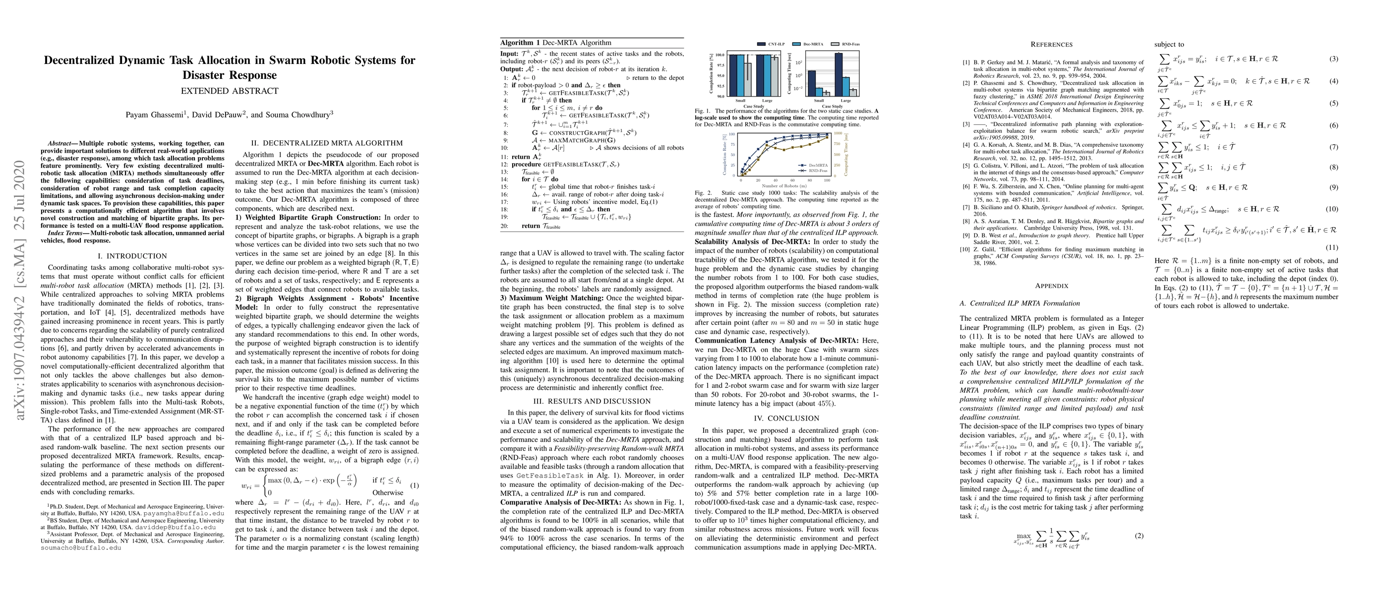 This paper proposes a decentralized algorithm for dynamic task allocation in swarm robotic systems, focusing on disaster response scenarios. The algorithm efficiently handles task deadlines, robot limitations, and dynamic task environments through bipartite graph construction and matching, demonstrated via a multi-UAV flood response application.
