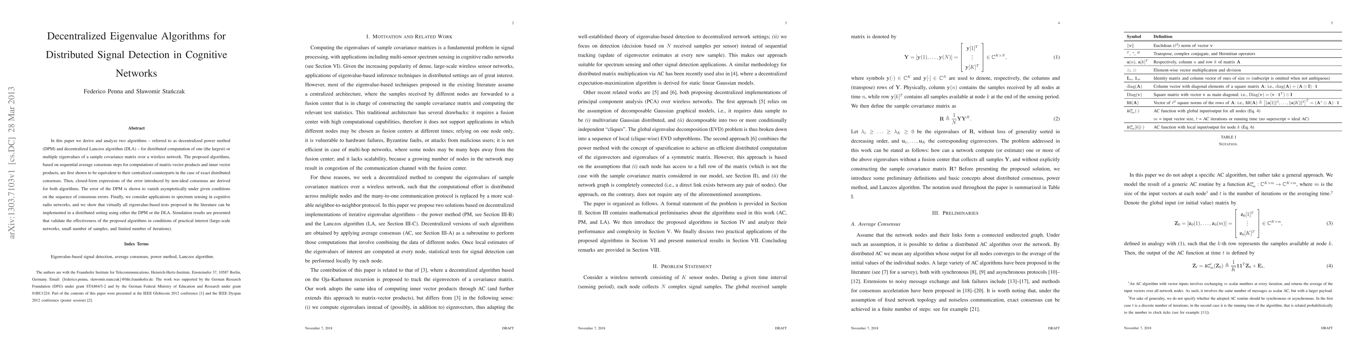 This paper proposes decentralized eigenvalue algorithms, DPM and DLA, for distributed signal detection in cognitive networks. Both algorithms achieve results equivalent to centralized methods, with error analysis under non-ideal consensus, and are validated through simulations for practical applications in spectrum sensing.